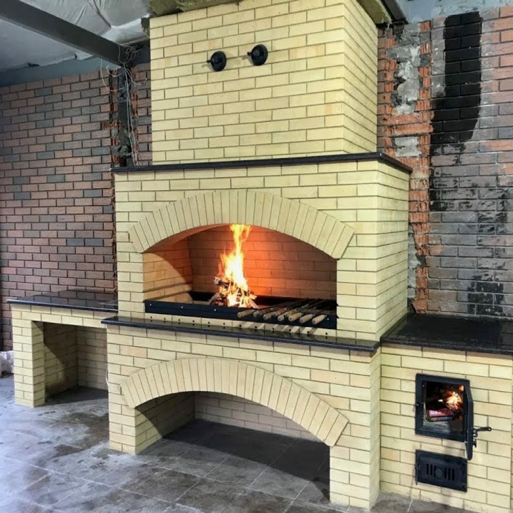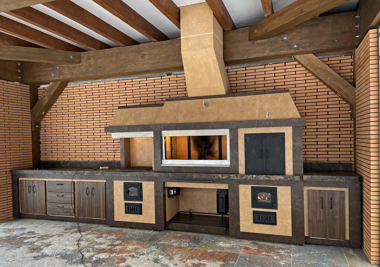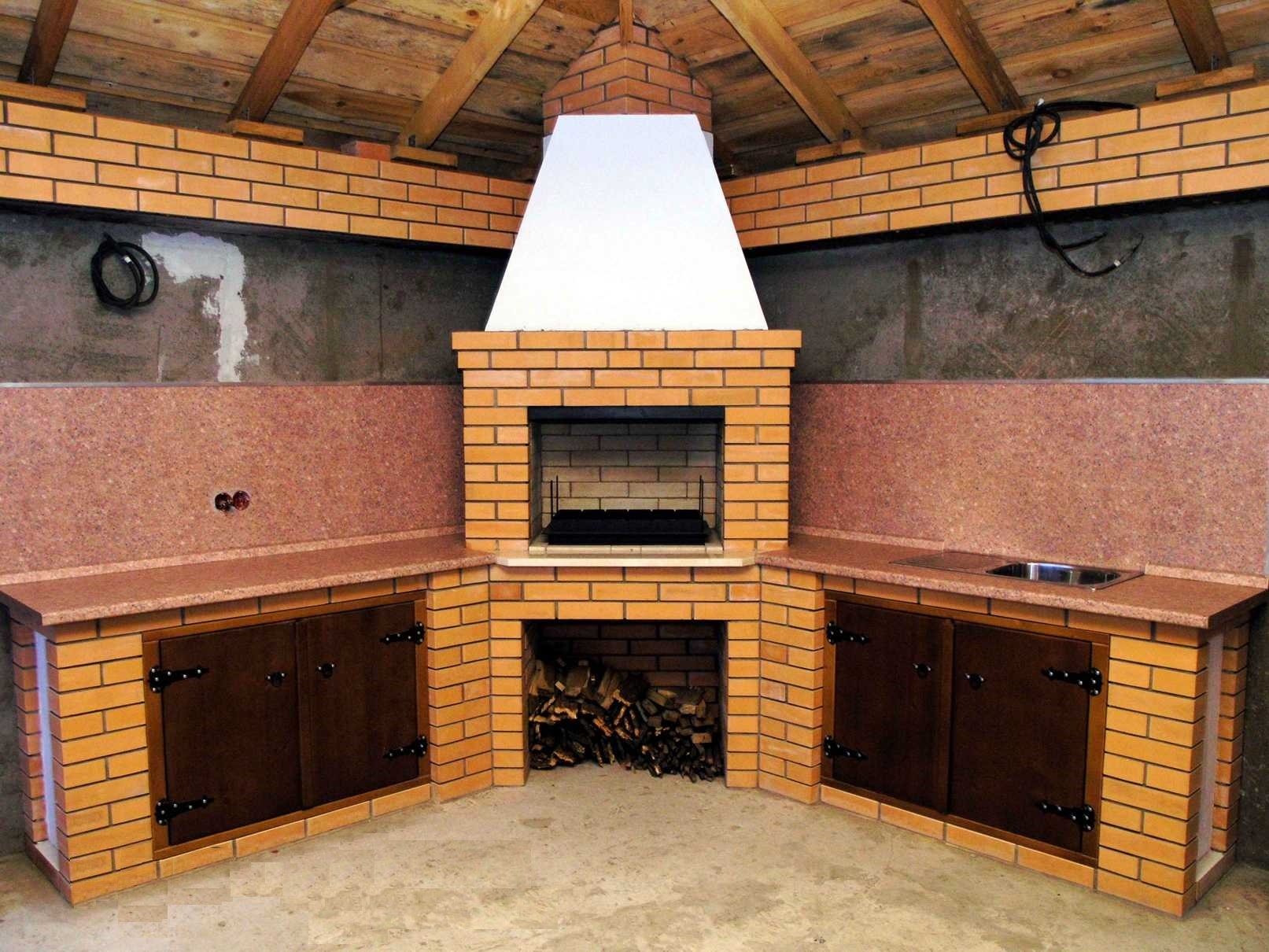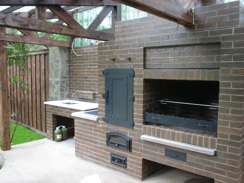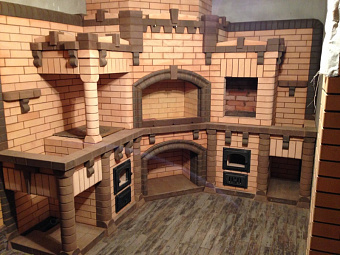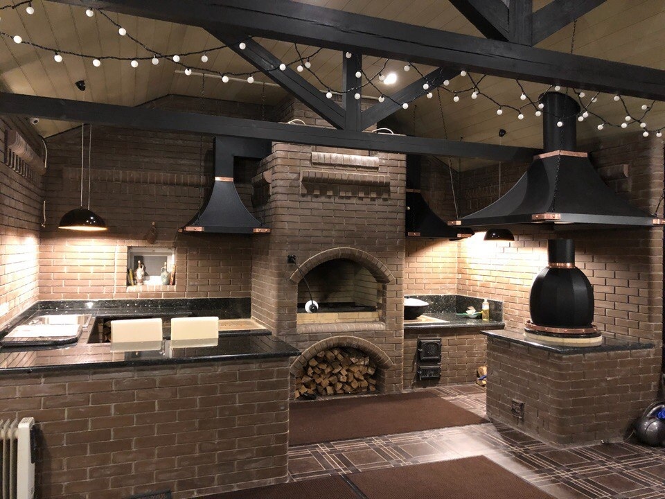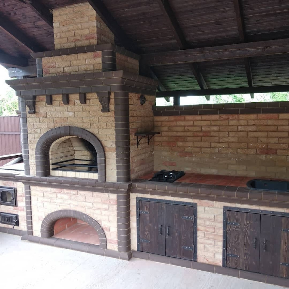 Кирпичные барбекю — для настоящий мужчин, предпочитающих качественный отдых в компании своих любимых женщин, настоящих друзей и коллег. Кирпич не любит спешки и предпочитает основательный фундамент. Выбирая его, вы выбираете долговечность и надёжность. Зона барбекю включает разные виды очагов – казан (12, 20 литров), мангал (от 60 до 120 см и более), тандыр, коптильню. Для придания вкуса можно также установить небольшую русскую печь и электровертель. Неотъемлемая часть — рабочая зона с столешницей из натурального камня, шкафчики для хранения посуды, мойка. При необходимости — хозяйственный блок. По желанию — барная стойка, чтобы скрасить время приготовления еды. Одна из вещей, на которые можно смотреть бесконечно — горение дров. Чтобы дым уходил как и куда надо (и при этом делал это красиво) важна конструкция дымового зуба. Наша команда гарантирует его исполнение на самом высоком уровне. Что касается внешнего вида кирпичного барбекю, то здесь есть, где «разгуляться» — подходит облицовка абсолютно любым кирпичом, плиткой. Реально и создание узоров в разных стилистических и цветовых решениях.