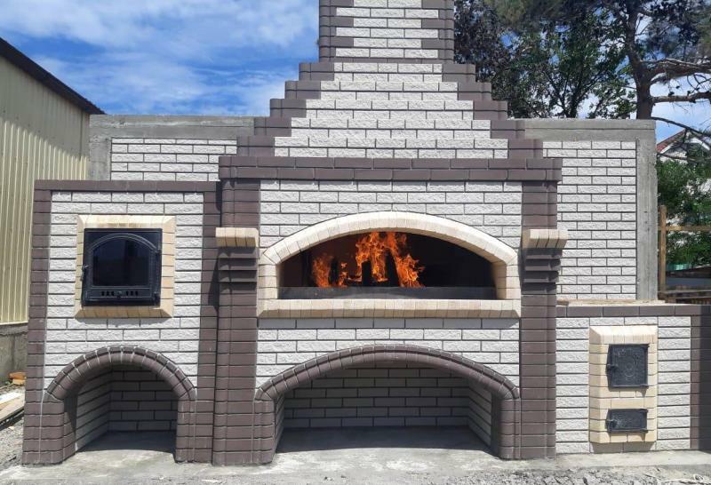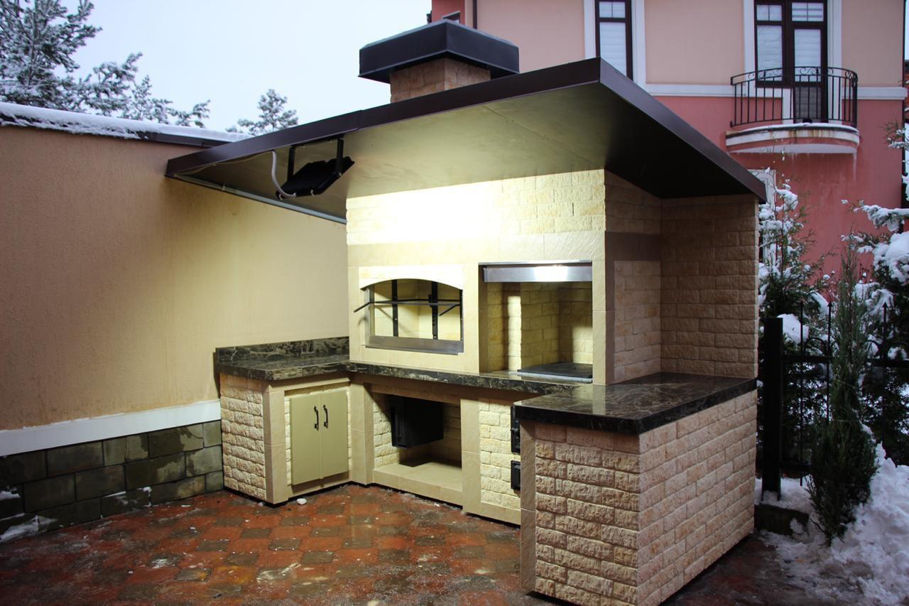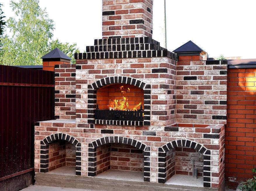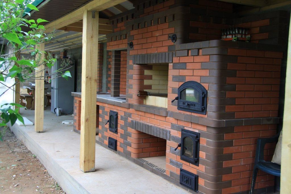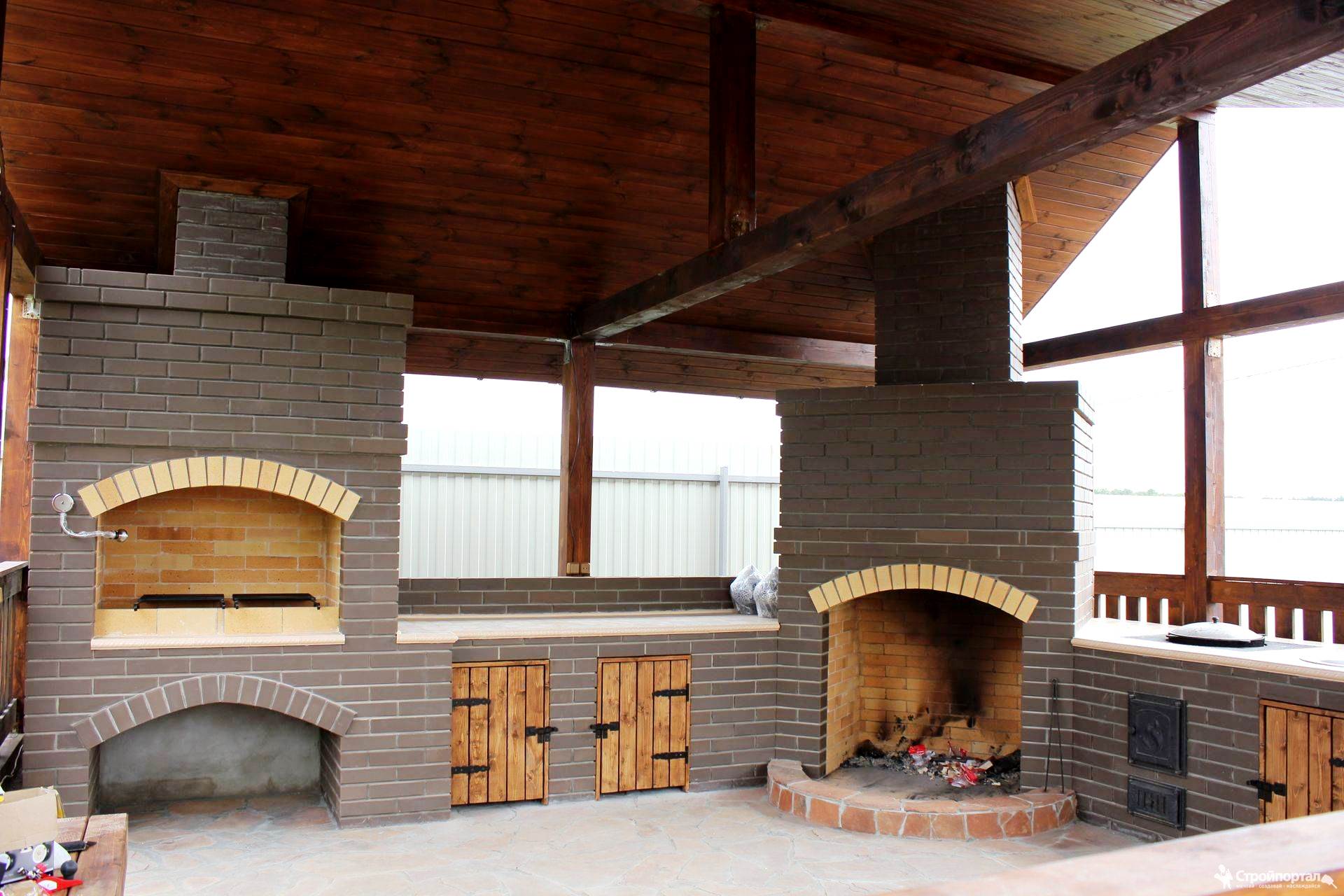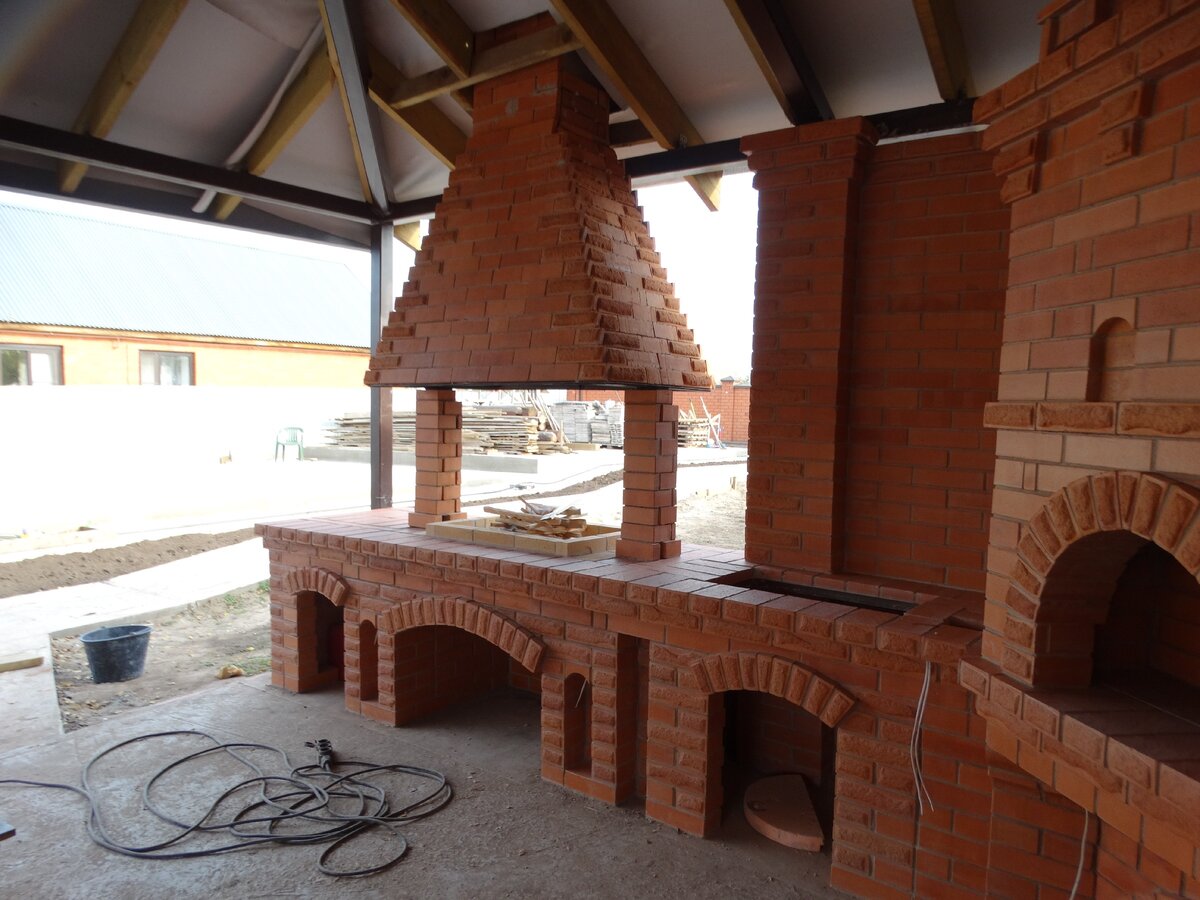 Кирпичные барбекю — для настоящий мужчин, предпочитающих качественный отдых в компании своих любимых женщин, настоящих друзей и коллег. Кирпич не любит спешки и предпочитает основательный фундамент. Выбирая его, вы выбираете долговечность и надёжность. Зона барбекю включает разные виды очагов – казан (12, 20 литров), мангал (от 60 до 120 см и более), тандыр, коптильню. Для придания вкуса можно также установить небольшую русскую печь и электровертель. Неотъемлемая часть — рабочая зона с столешницей из натурального камня, шкафчики для хранения посуды, мойка. При необходимости — хозяйственный блок. По желанию — барная стойка, чтобы скрасить время приготовления еды. Одна из вещей, на которые можно смотреть бесконечно — горение дров. Чтобы дым уходил как и куда надо (и при этом делал это красиво) важна конструкция дымового зуба. Наша команда гарантирует его исполнение на самом высоком уровне. Что касается внешнего вида кирпичного барбекю, то здесь есть, где «разгуляться» — подходит облицовка абсолютно любым кирпичом, плиткой. Реально и создание узоров в разных стилистических и цветовых решениях.