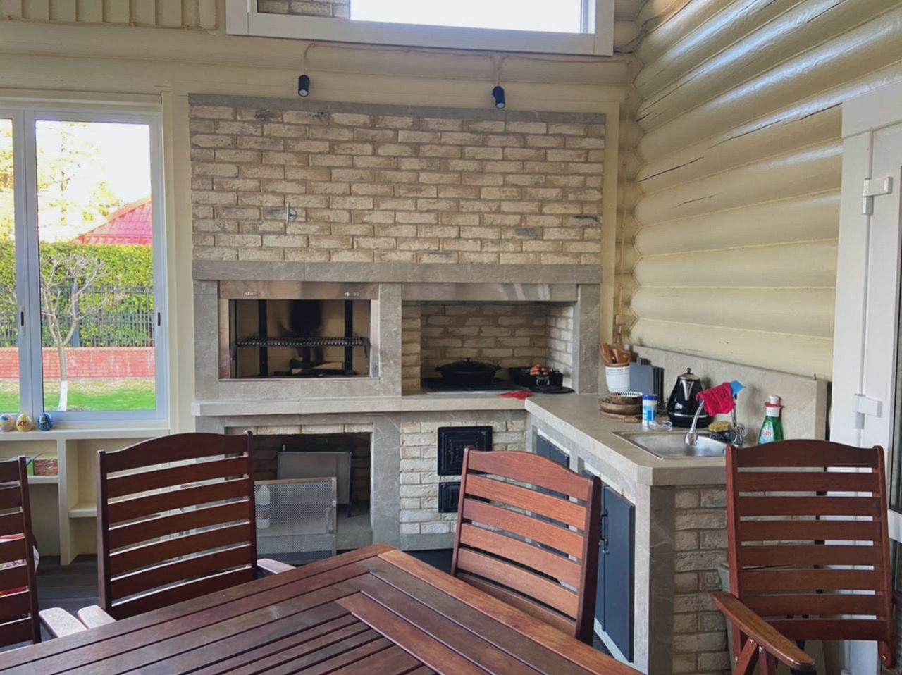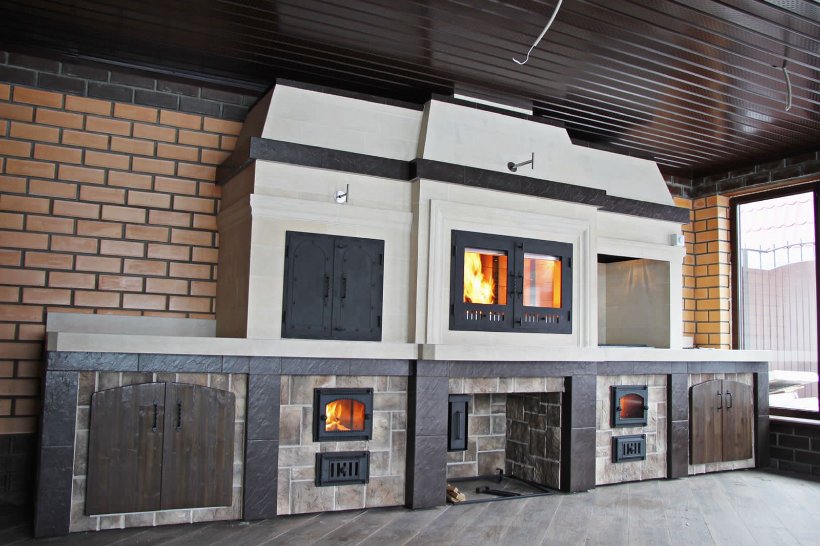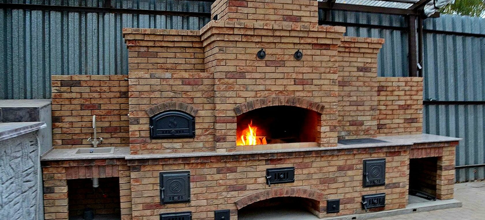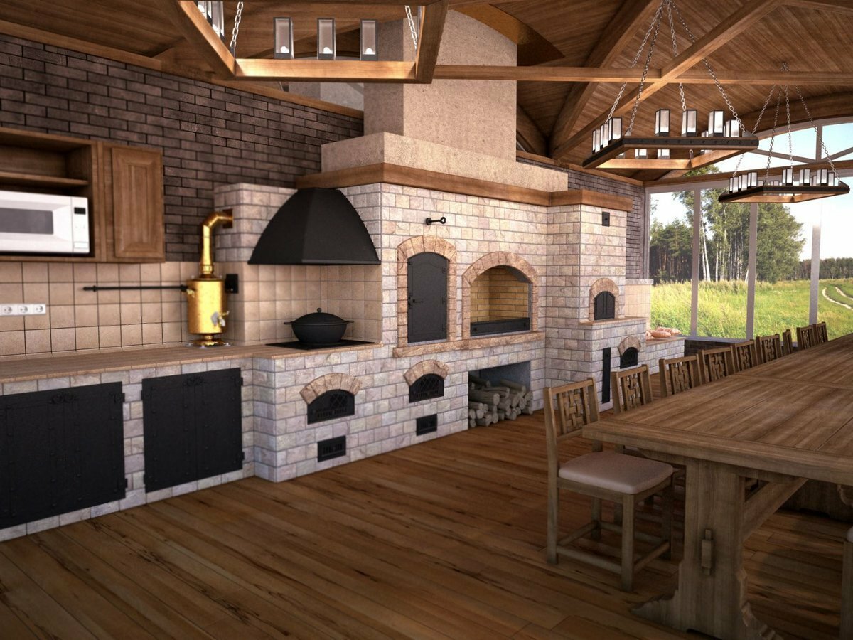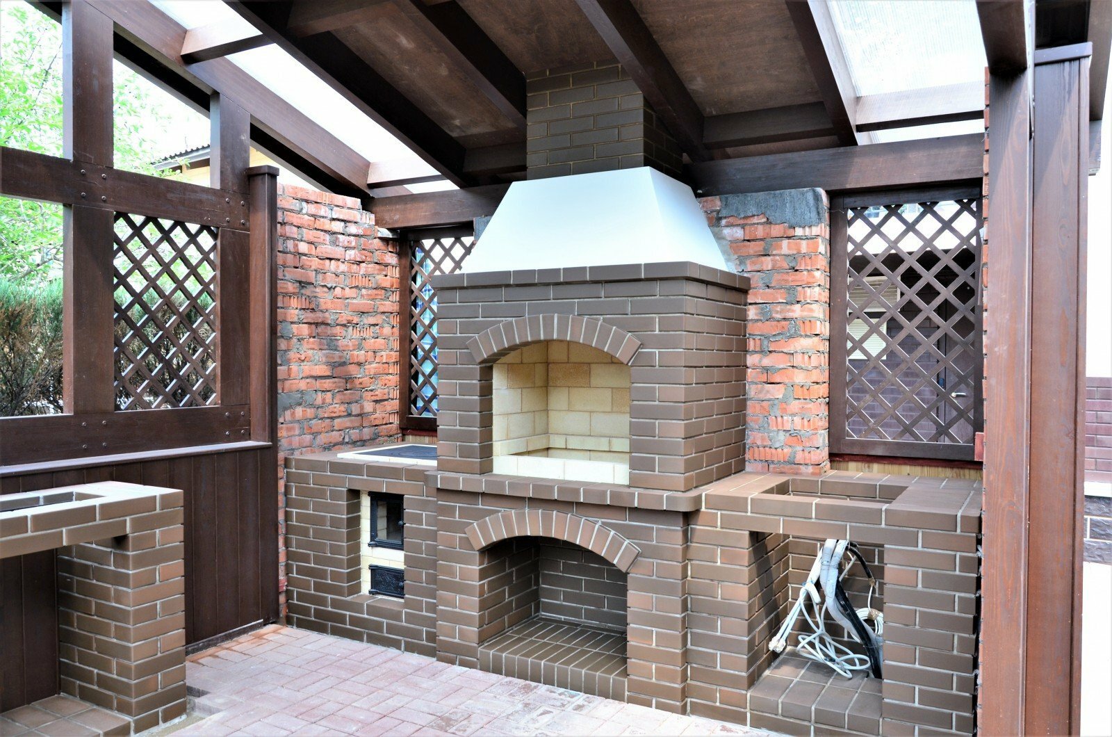 Кирпичные барбекю — для настоящий мужчин, предпочитающих качественный отдых в компании своих любимых женщин, настоящих друзей и коллег. Кирпич не любит спешки и предпочитает основательный фундамент. Выбирая его, вы выбираете долговечность и надёжность. Зона барбекю включает разные виды очагов – казан (12, 20 литров), мангал (от 60 до 120 см и более), тандыр, коптильню. Для придания вкуса можно также установить небольшую русскую печь и электровертель. Неотъемлемая часть — рабочая зона с столешницей из натурального камня, шкафчики для хранения посуды, мойка. При необходимости — хозяйственный блок. По желанию — барная стойка, чтобы скрасить время приготовления еды. Одна из вещей, на которые можно смотреть бесконечно — горение дров. Чтобы дым уходил как и куда надо (и при этом делал это красиво) важна конструкция дымового зуба. Наша команда гарантирует его исполнение на самом высоком уровне. Что касается внешнего вида кирпичного барбекю, то здесь есть, где «разгуляться» — подходит облицовка абсолютно любым кирпичом, плиткой. Реально и создание узоров в разных стилистических и цветовых решениях.