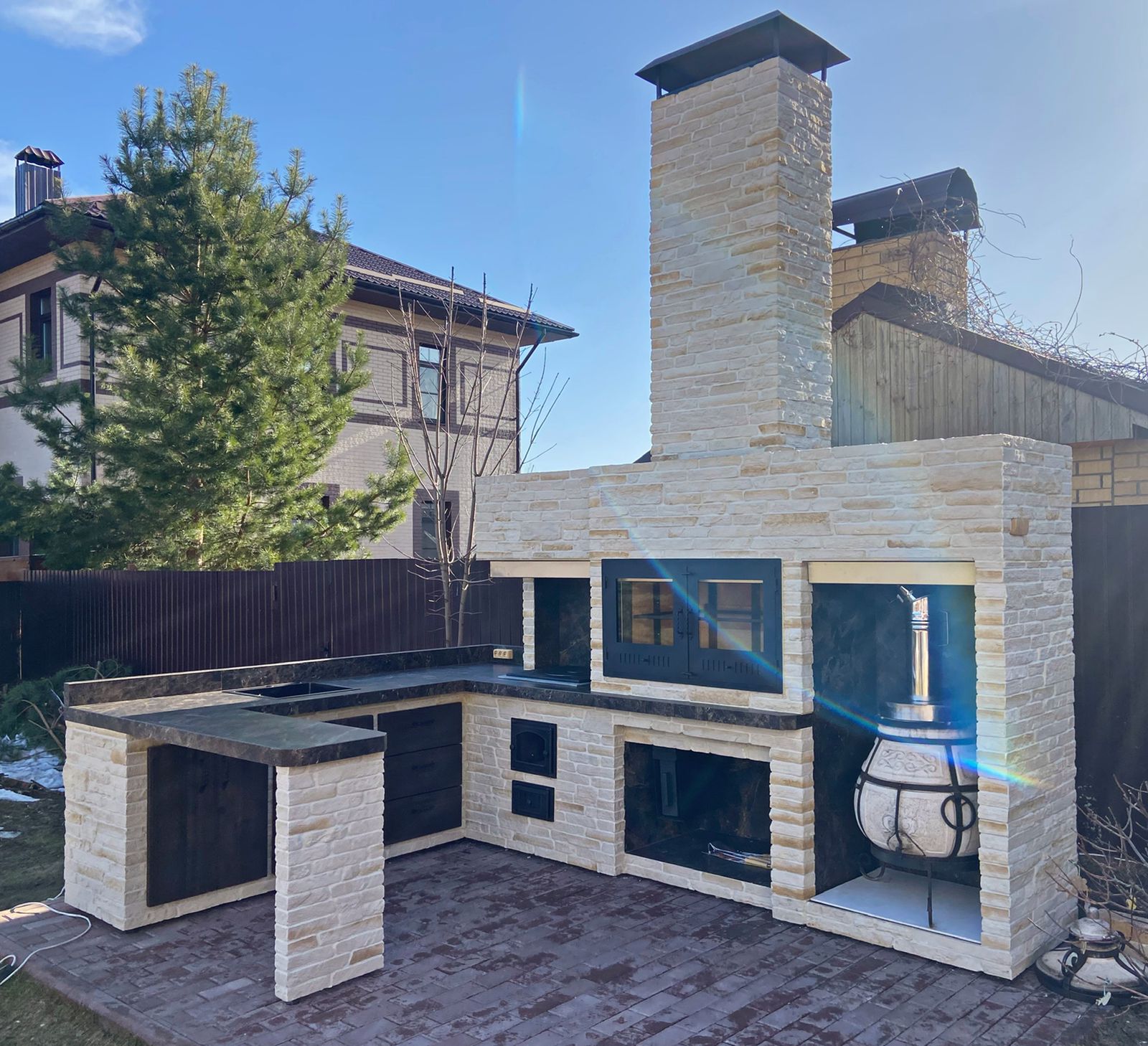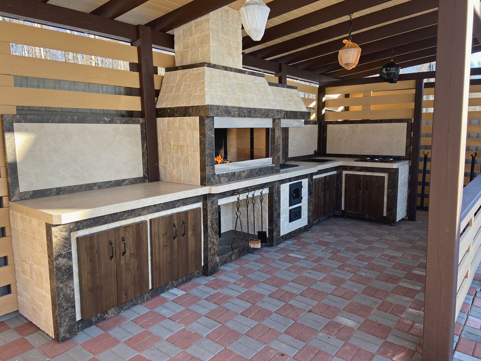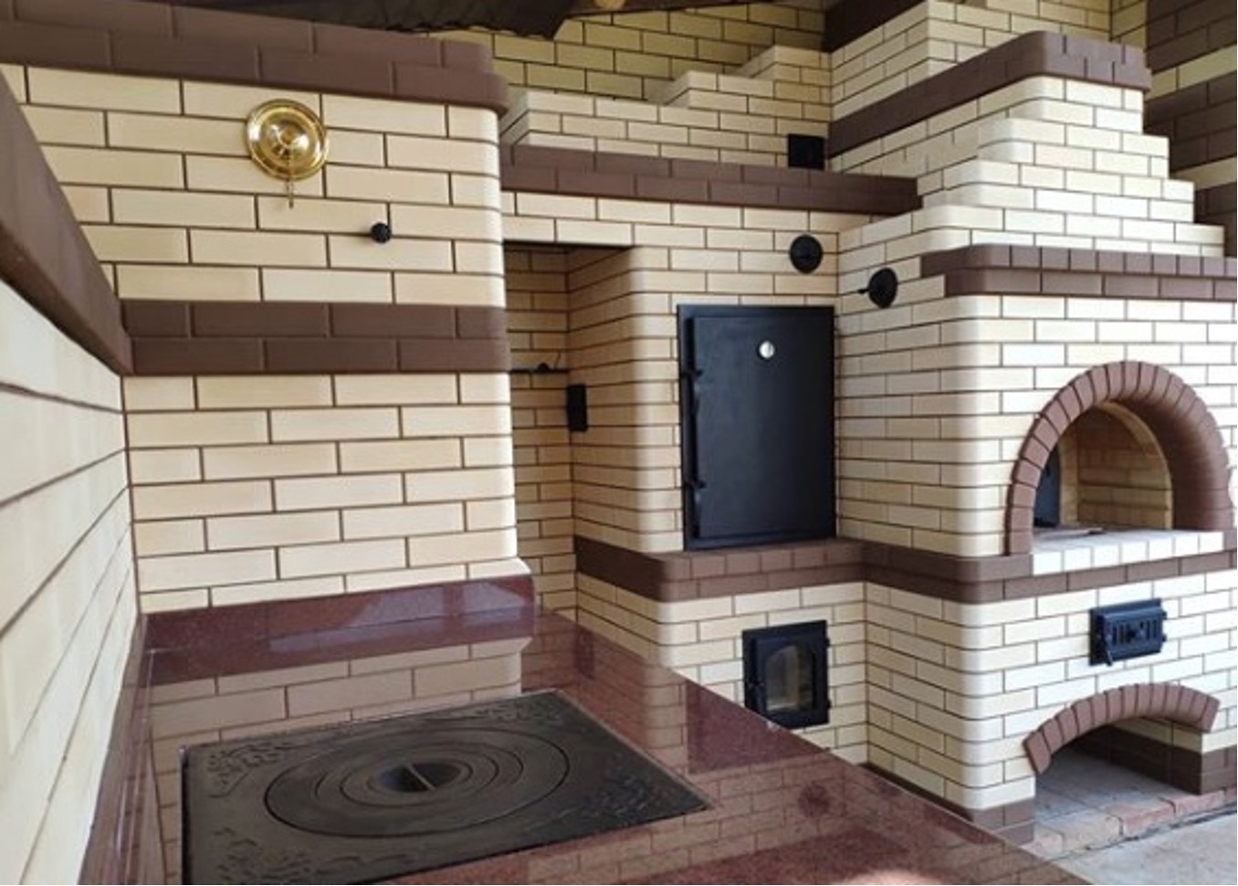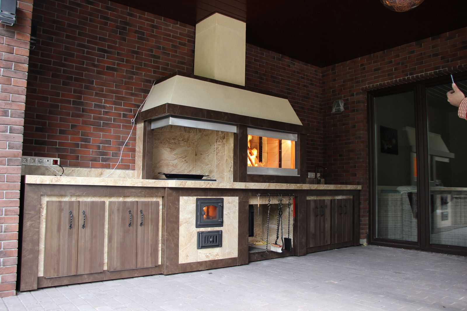 Кирпичные барбекю — для настоящий мужчин, предпочитающих качественный отдых в компании своих любимых женщин, настоящих друзей и коллег. Кирпич не любит спешки и предпочитает основательный фундамент. Выбирая его, вы выбираете долговечность и надёжность. Зона барбекю включает разные виды очагов – казан (12, 20 литров), мангал (от 60 до 120 см и более), тандыр, коптильню. Для придания вкуса можно также установить небольшую русскую печь и электровертель. Неотъемлемая часть — рабочая зона с столешницей из натурального камня, шкафчики для хранения посуды, мойка. При необходимости — хозяйственный блок. По желанию — барная стойка, чтобы скрасить время приготовления еды. Одна из вещей, на которые можно смотреть бесконечно — горение дров. Чтобы дым уходил как и куда надо (и при этом делал это красиво) важна конструкция дымового зуба. Наша команда гарантирует его исполнение на самом высоком уровне. Что касается внешнего вида кирпичного барбекю, то здесь есть, где «разгуляться» — подходит облицовка абсолютно любым кирпичом, плиткой. Реально и создание узоров в разных стилистических и цветовых решениях.