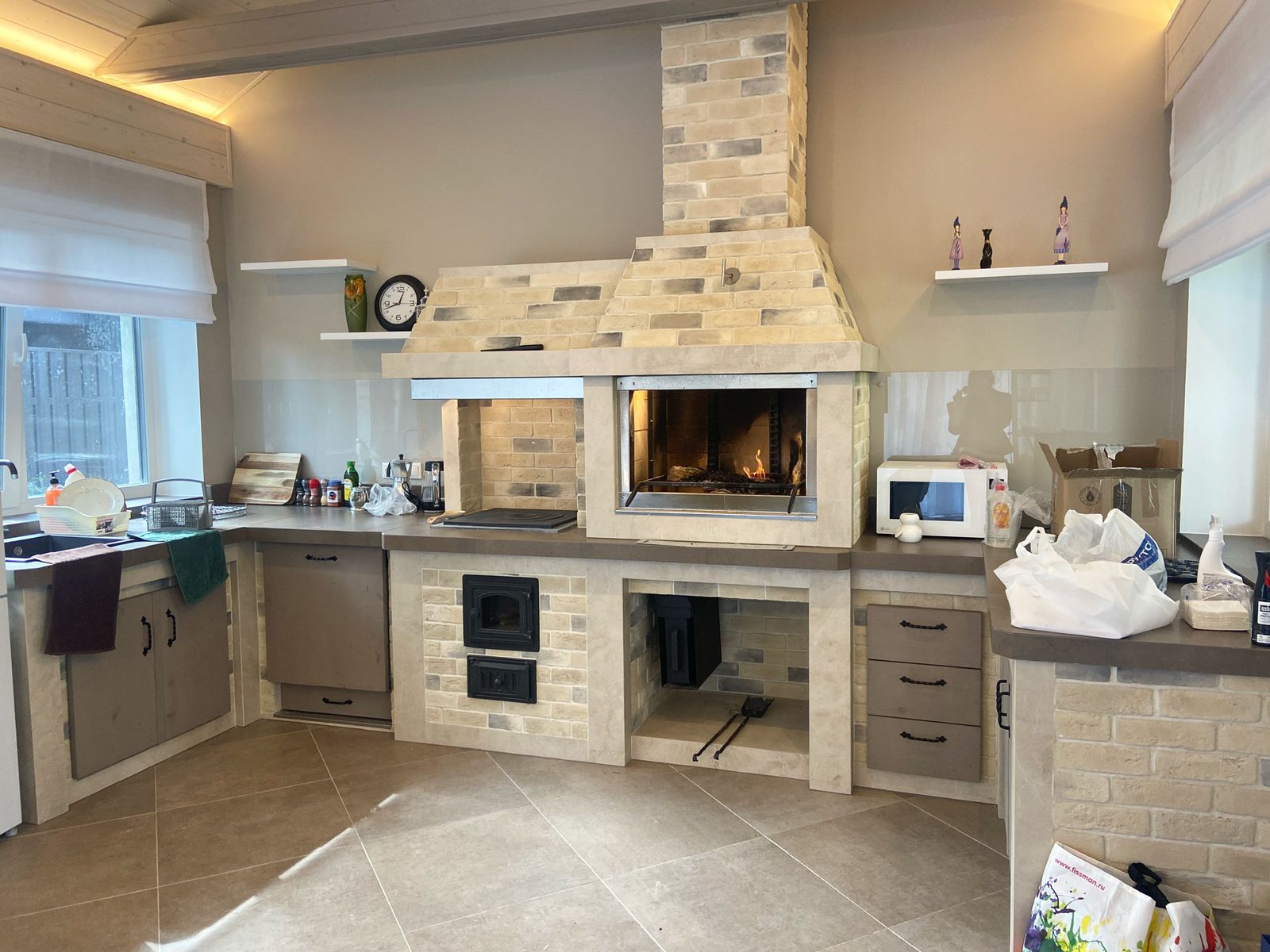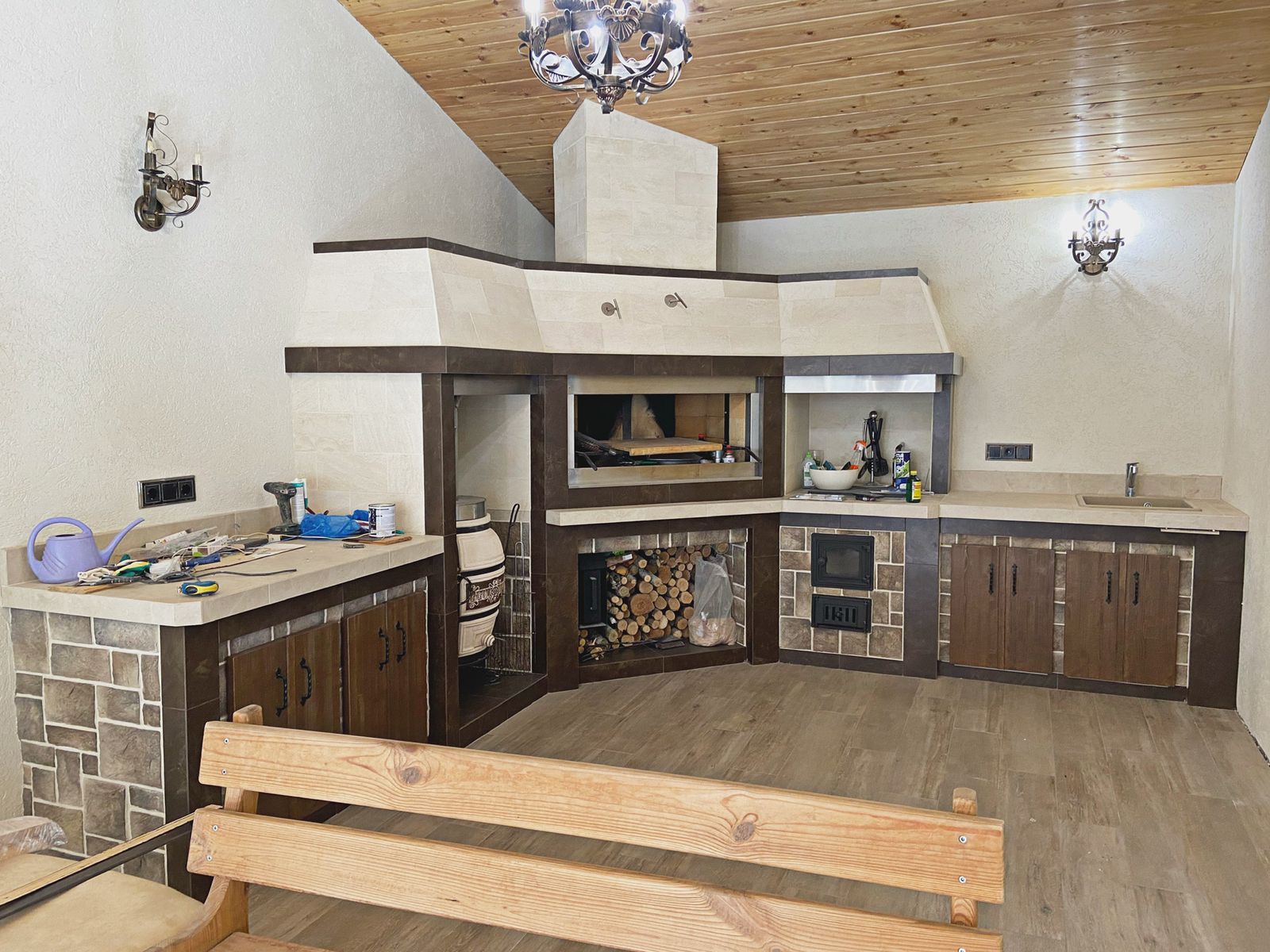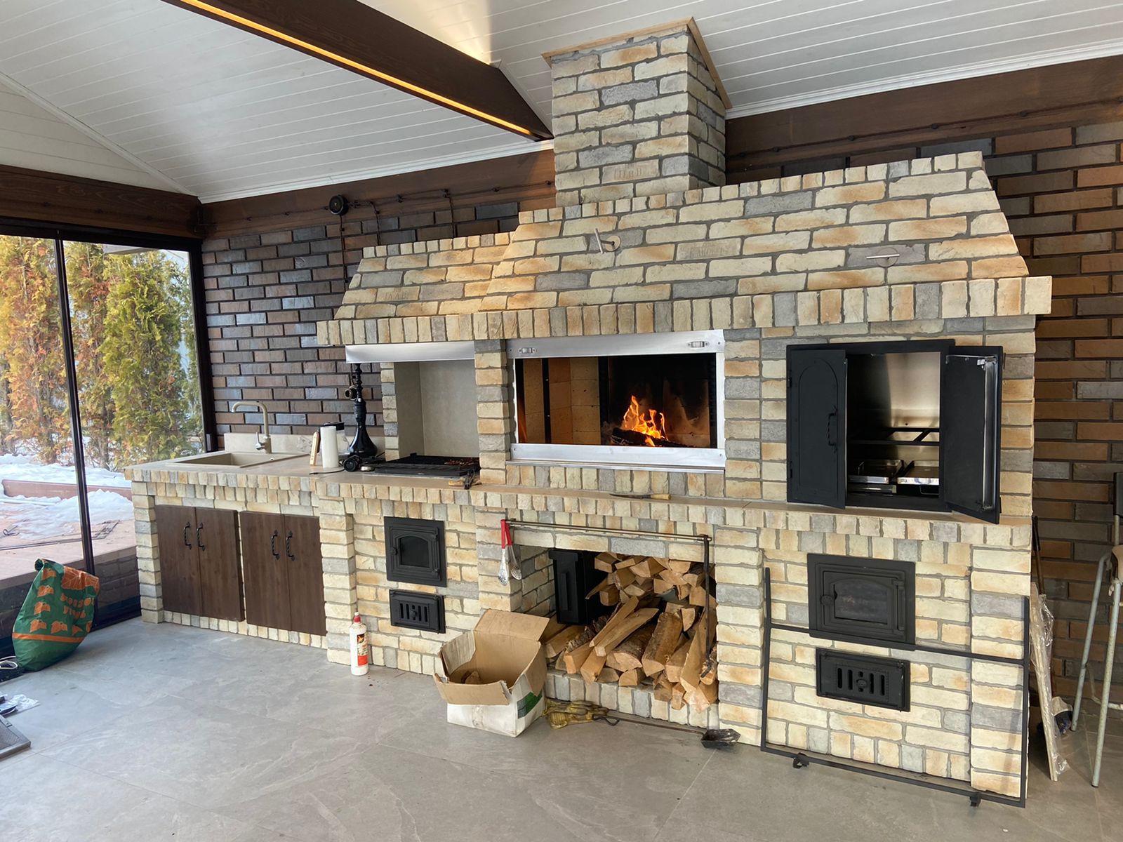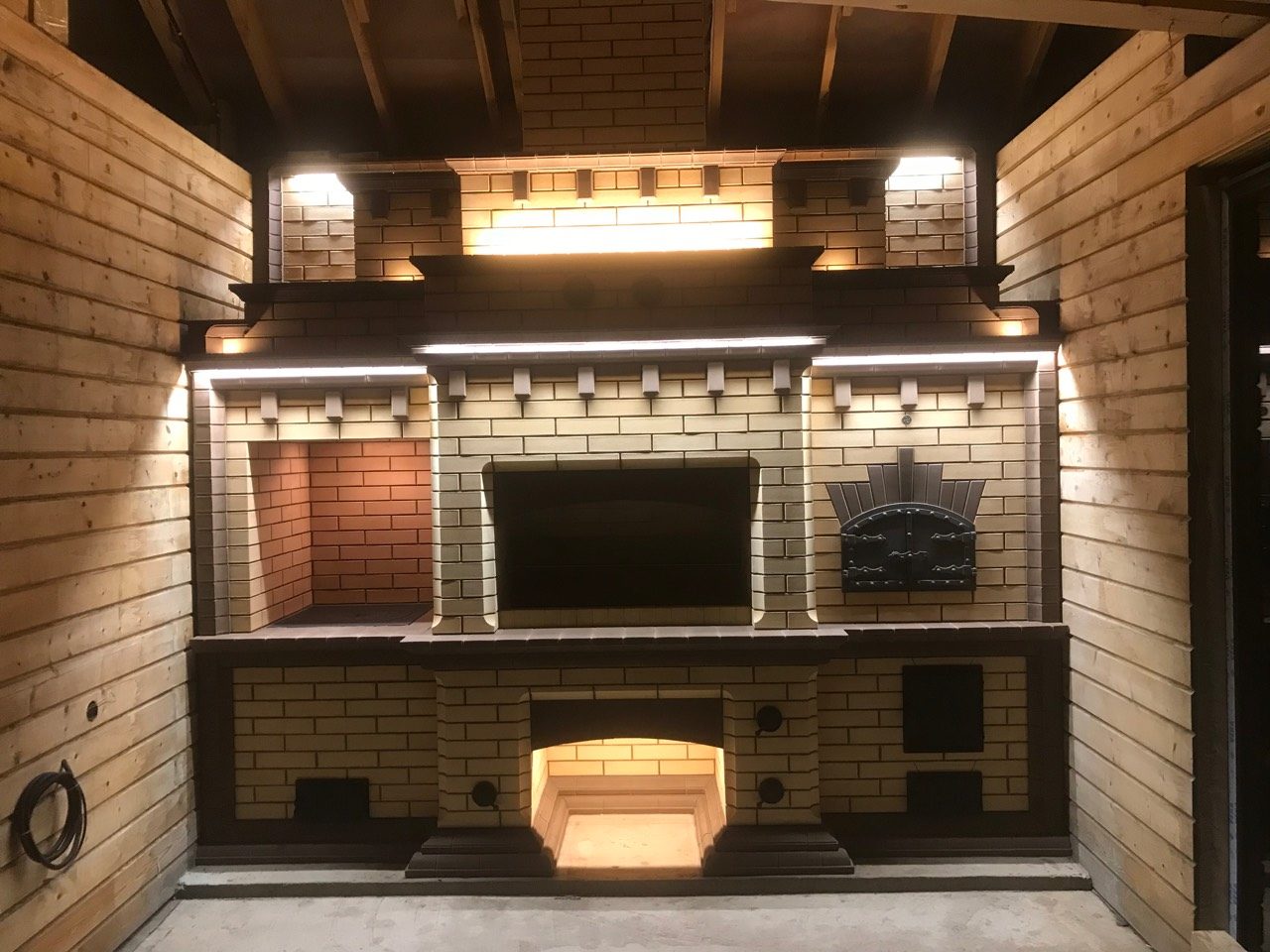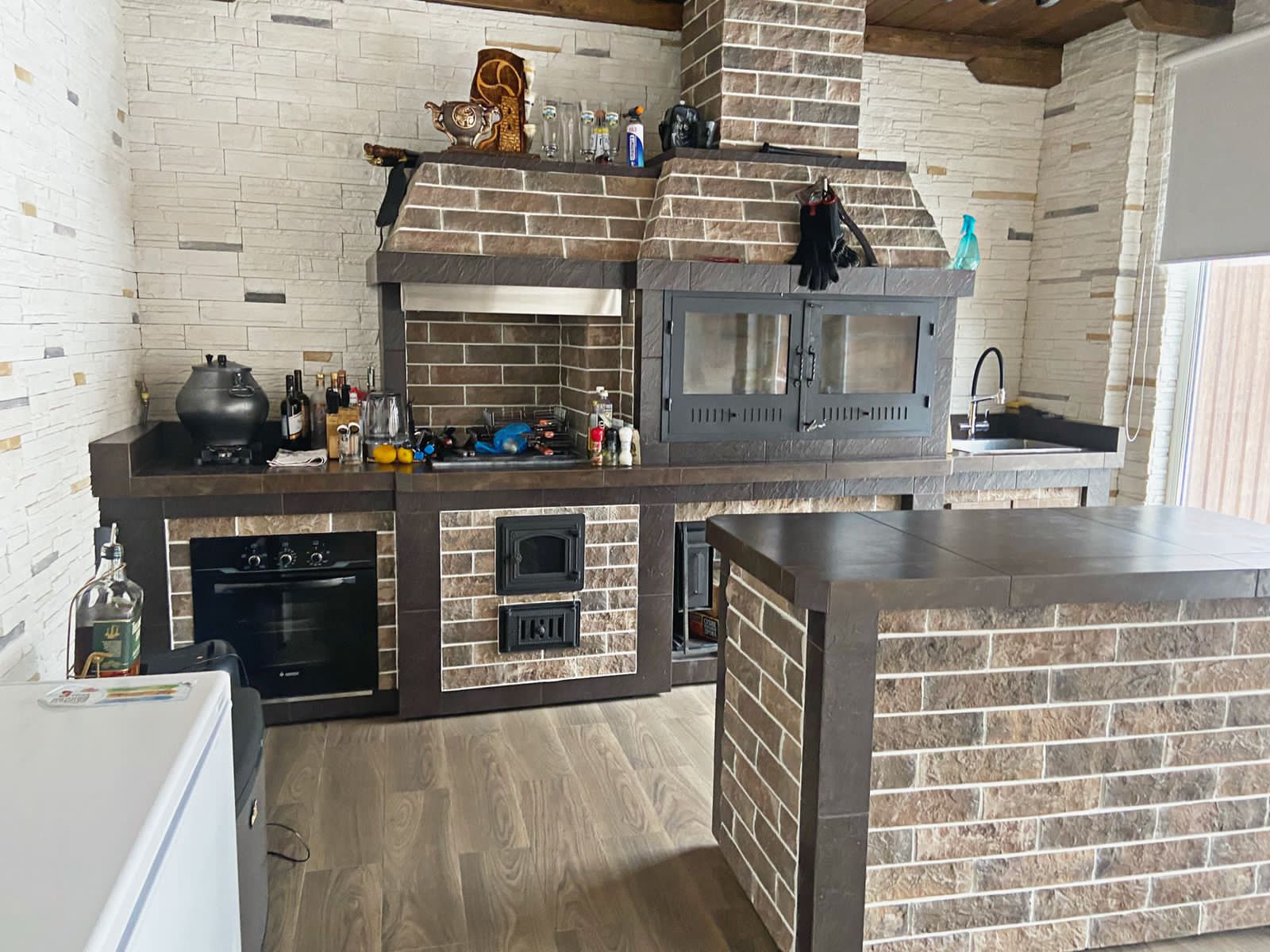 Кирпичные барбекю — для настоящий мужчин, предпочитающих качественный отдых в компании своих любимых женщин, настоящих друзей и коллег. Кирпич не любит спешки и предпочитает основательный фундамент. Выбирая его, вы выбираете долговечность и надёжность. Зона барбекю включает разные виды очагов – казан (12, 20 литров), мангал (от 60 до 120 см и более), тандыр, коптильню. Для придания вкуса можно также установить небольшую русскую печь и электровертель. Неотъемлемая часть — рабочая зона с столешницей из натурального камня, шкафчики для хранения посуды, мойка. При необходимости — хозяйственный блок. По желанию — барная стойка, чтобы скрасить время приготовления еды. Одна из вещей, на которые можно смотреть бесконечно — горение дров. Чтобы дым уходил как и куда надо (и при этом делал это красиво) важна конструкция дымового зуба. Наша команда гарантирует его исполнение на самом высоком уровне. Что касается внешнего вида кирпичного барбекю, то здесь есть, где «разгуляться» — подходит облицовка абсолютно любым кирпичом, плиткой. Реально и создание узоров в разных стилистических и цветовых решениях.