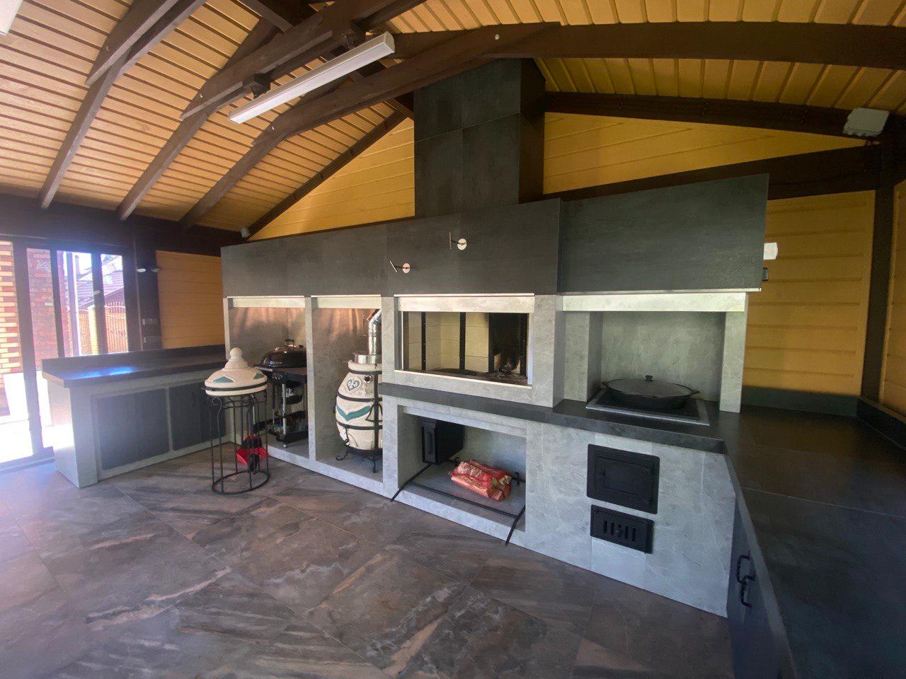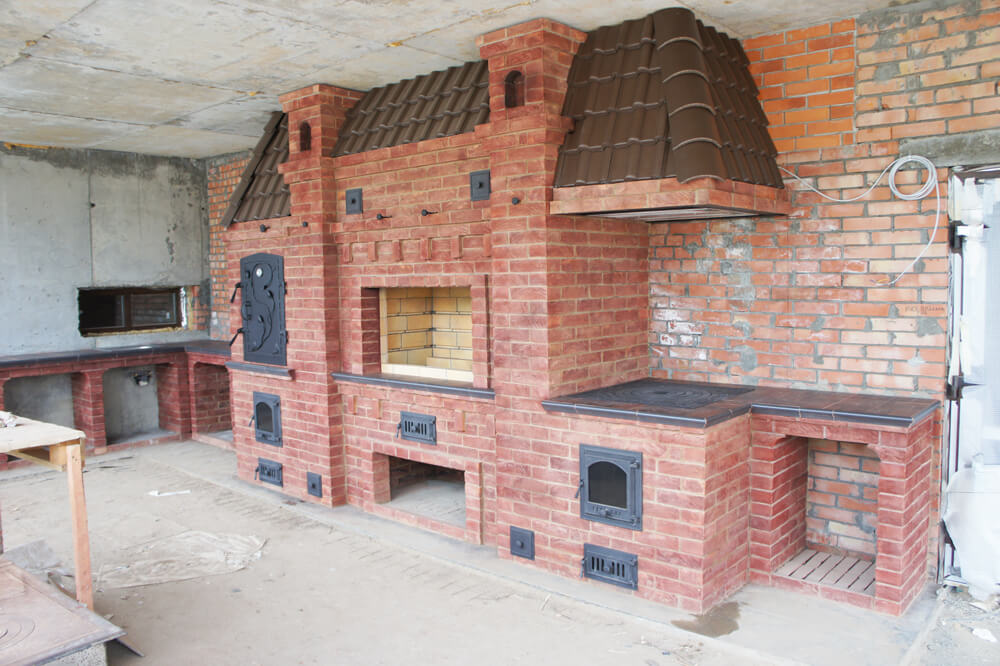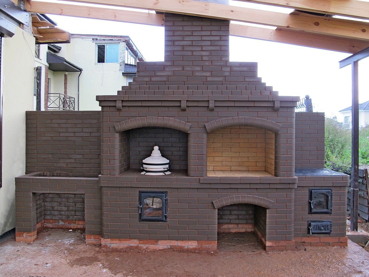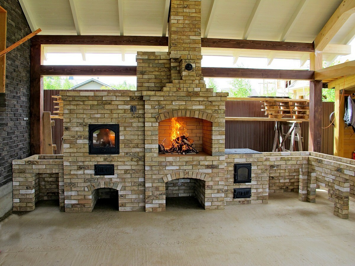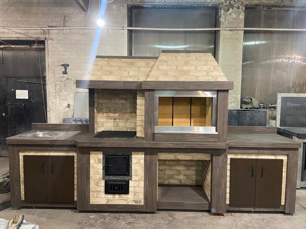 Хотите сбросить вес? Легко. Главная отличительная черта каркасного барбекю — облегчённая конструкция. Металл (внутри которого бальзоватовая вата) обшивается специальным негорючим материалом. Подходит практически любой вид отделки – от штукатурки до клинкерной плитки. Оснастить конструкцию можно казаном, тандыром, мангалом, коптильней, русской мини-печью. Устанавливается такое барбекю на любой вид поверхности. Благодаря технологии вашу каркасную беседку не отличить от кирпичной, в том числе по пожаростойкости. В общем, лёгкость рук и никакого мошенничества!