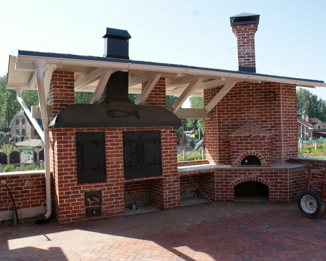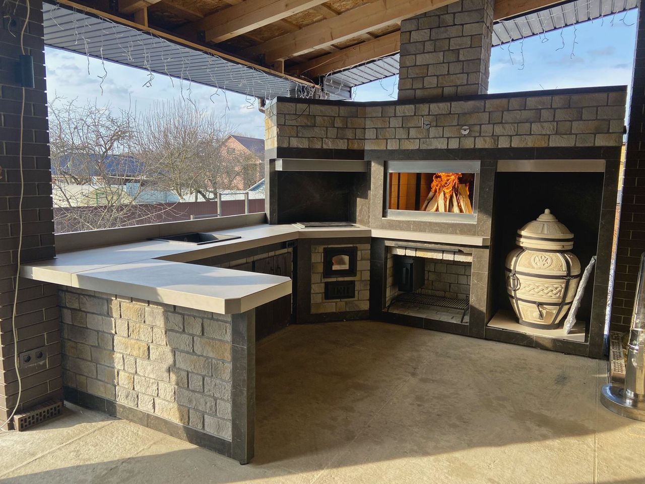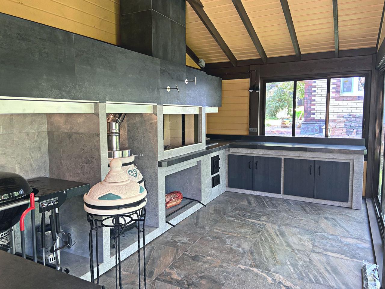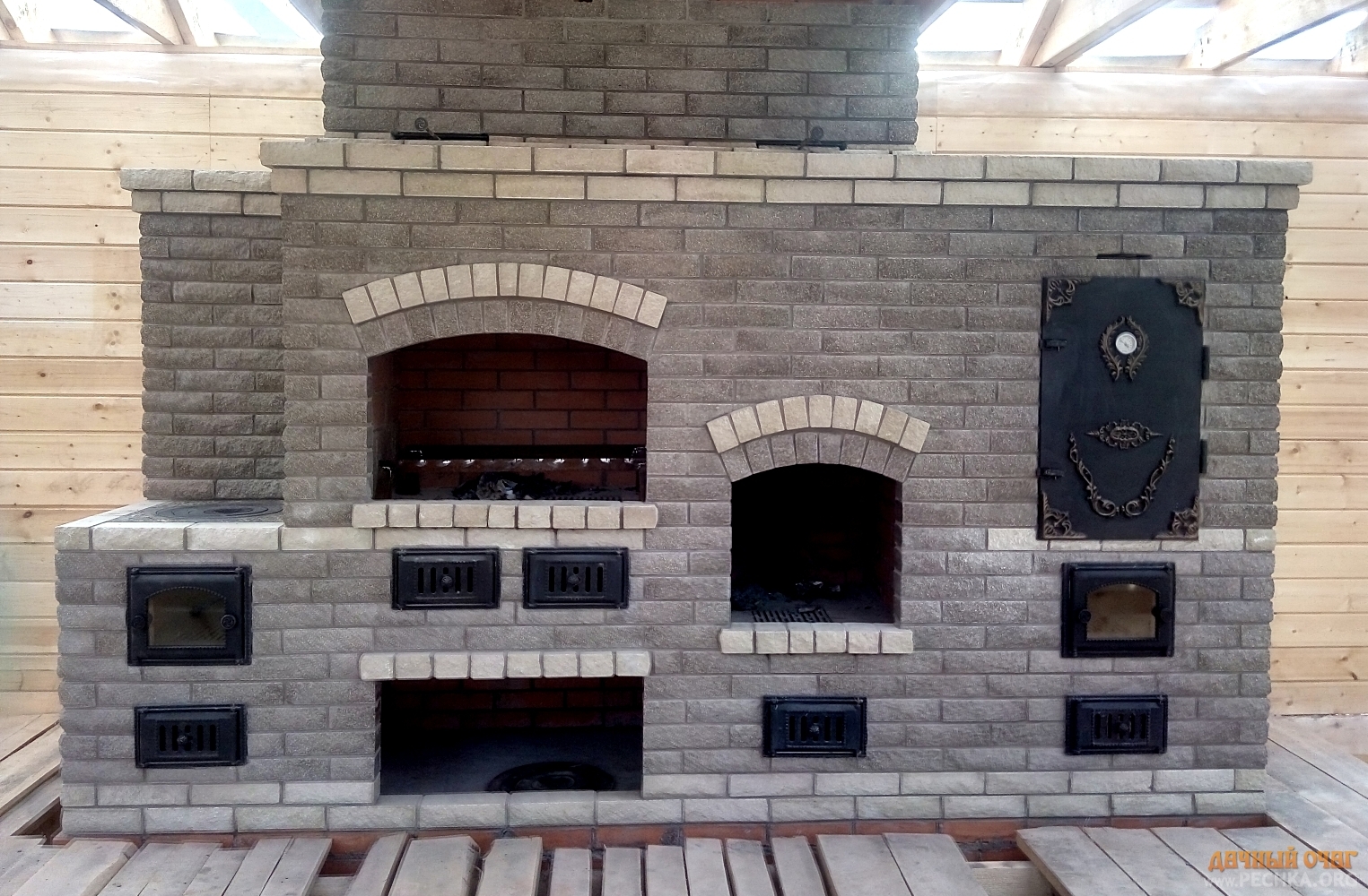 Хотите сбросить вес? Легко. Главная отличительная черта каркасного барбекю — облегчённая конструкция. Металл (внутри которого бальзоватовая вата) обшивается специальным негорючим материалом. Подходит практически любой вид отделки – от штукатурки до клинкерной плитки. Оснастить конструкцию можно казаном, тандыром, мангалом, коптильней, русской мини-печью. Устанавливается такое барбекю на любой вид поверхности. Благодаря технологии вашу каркасную беседку не отличить от кирпичной, в том числе по пожаростойкости. В общем, лёгкость рук и никакого мошенничества!