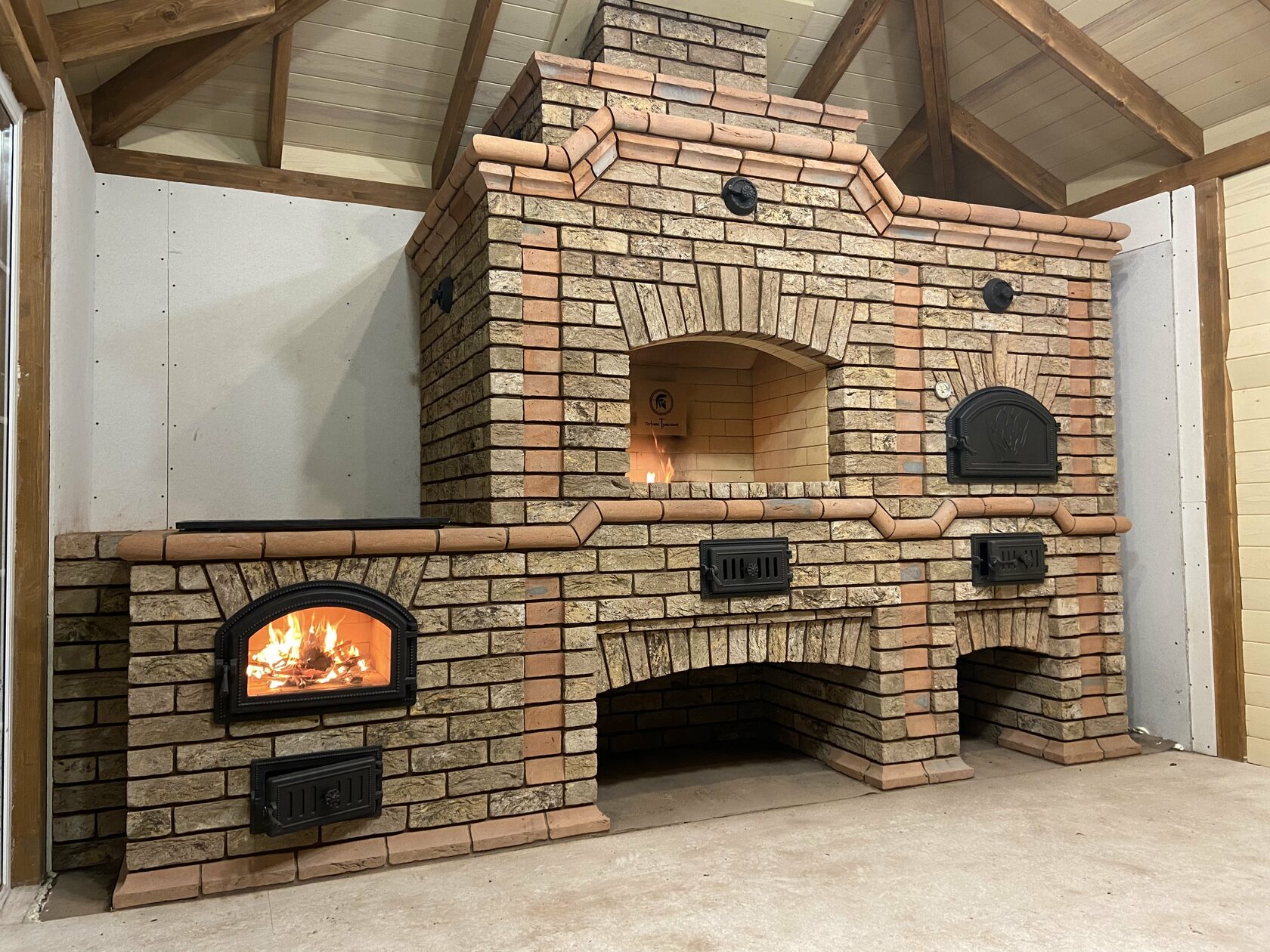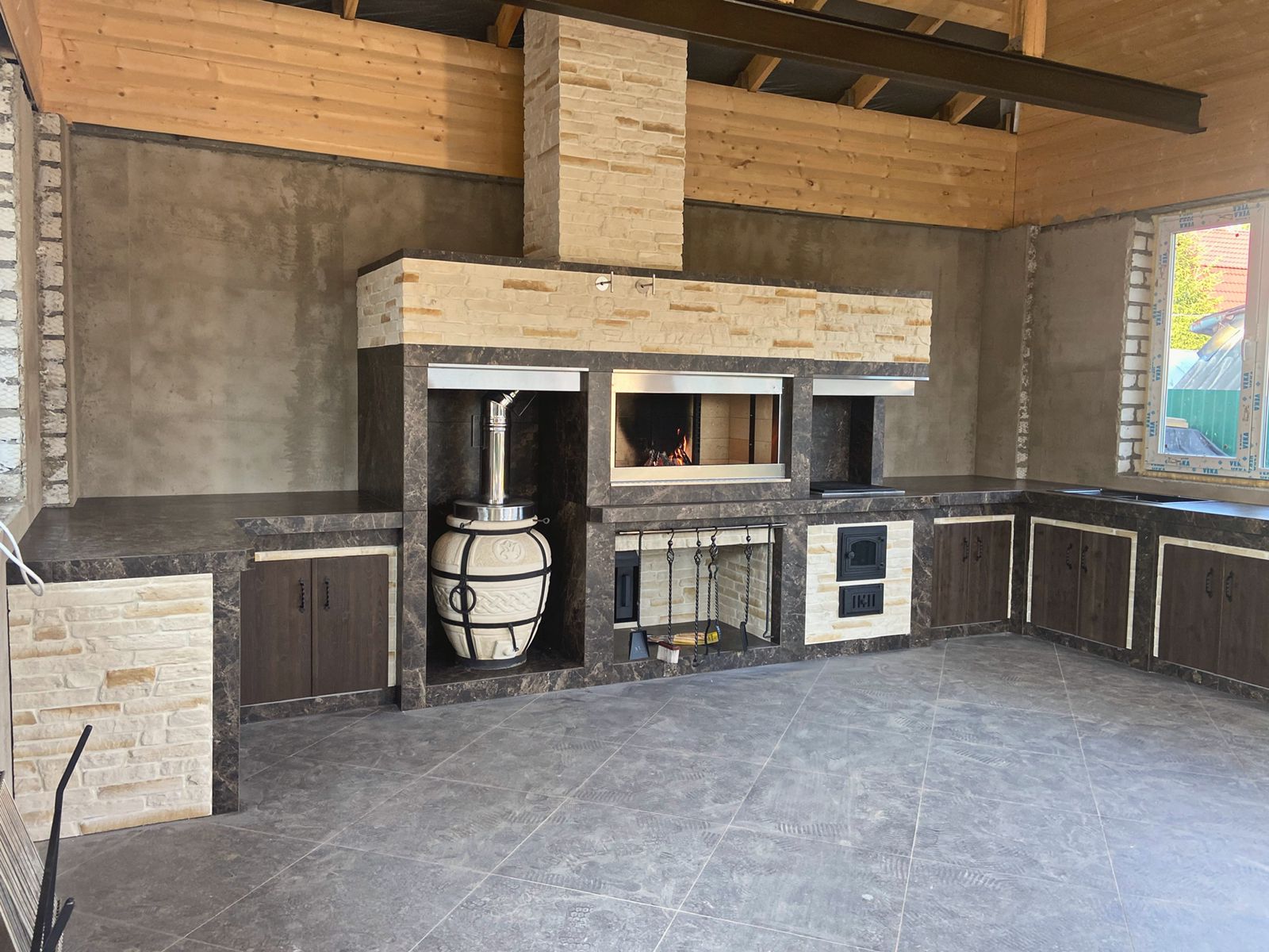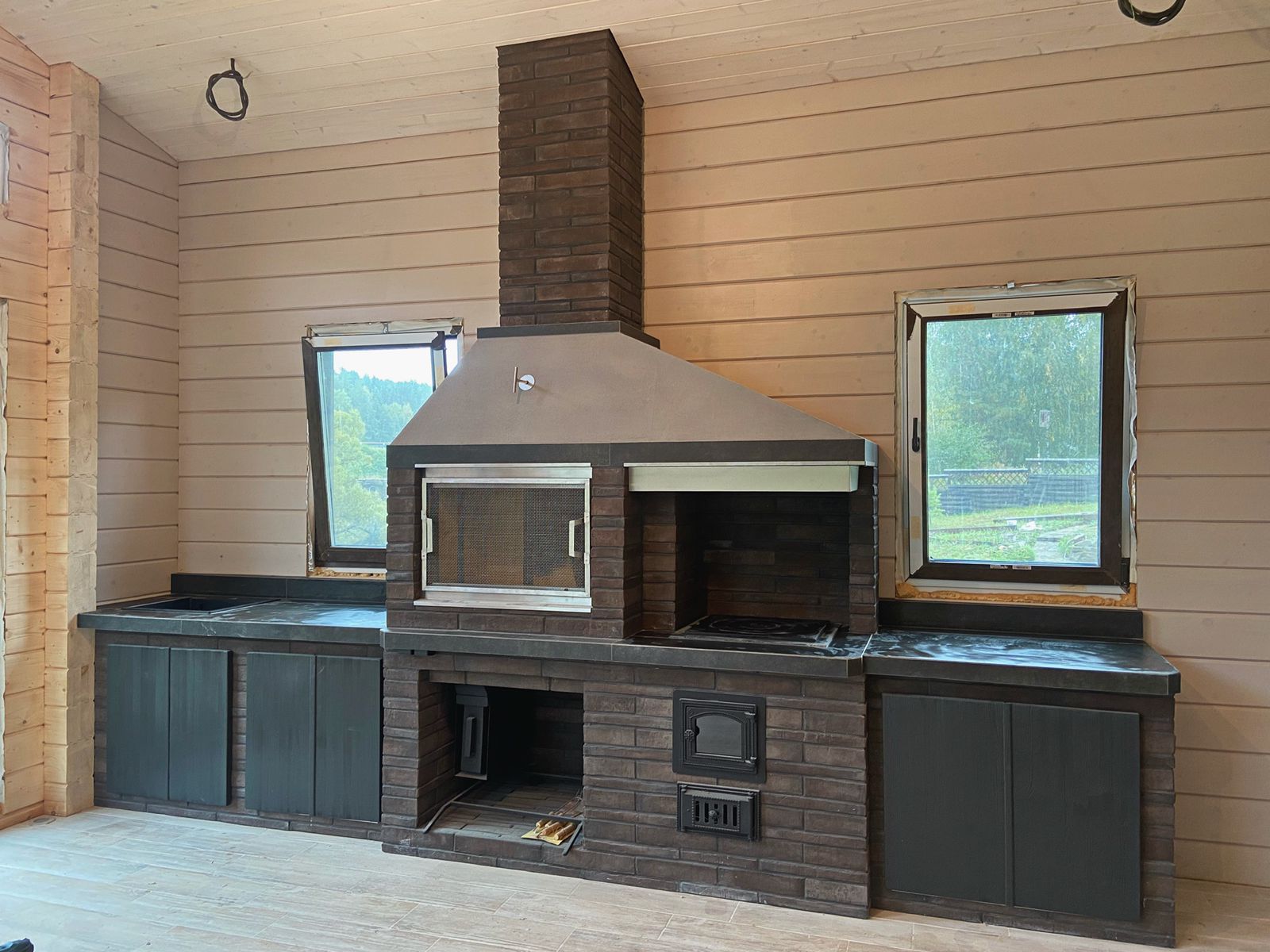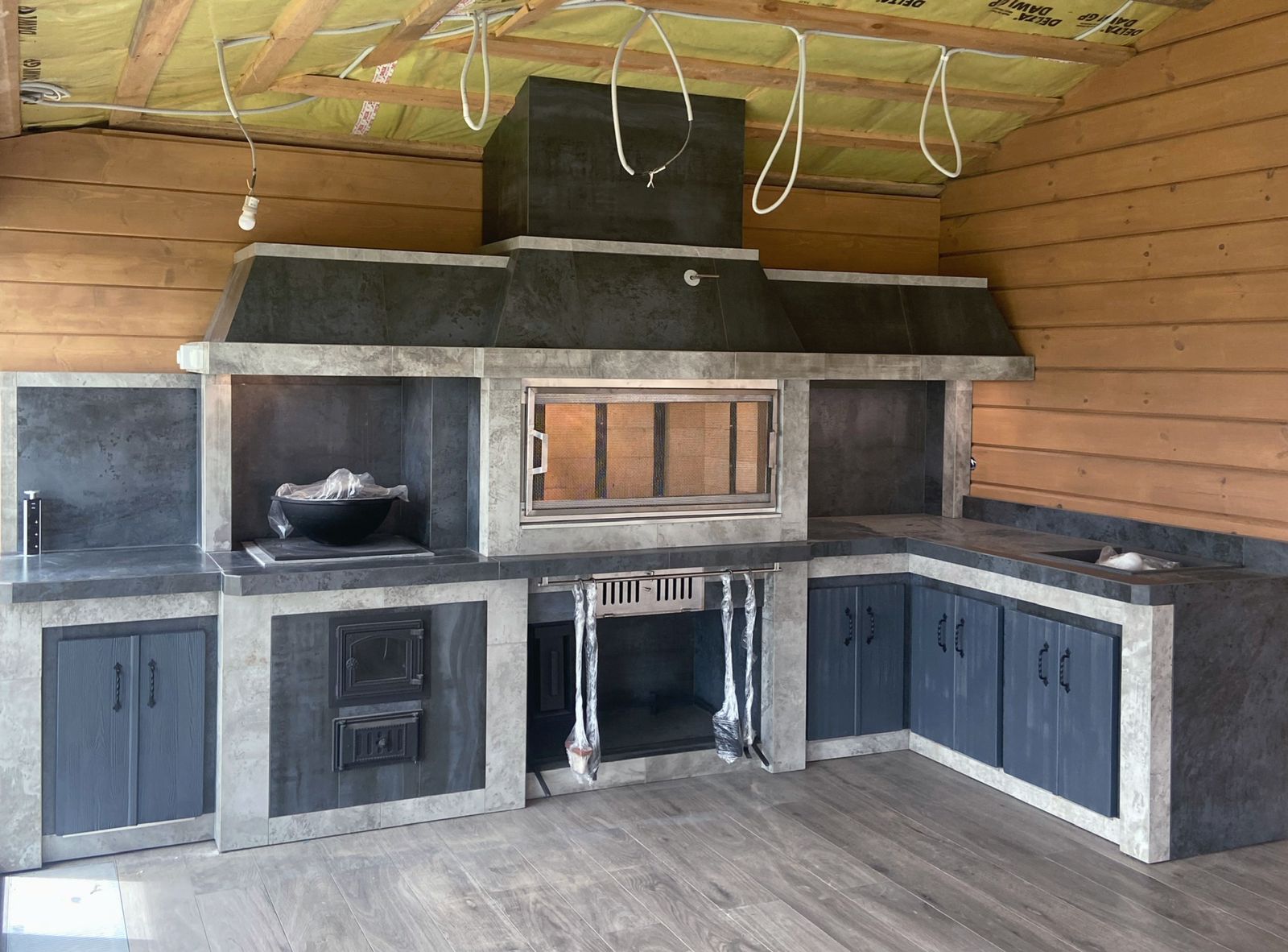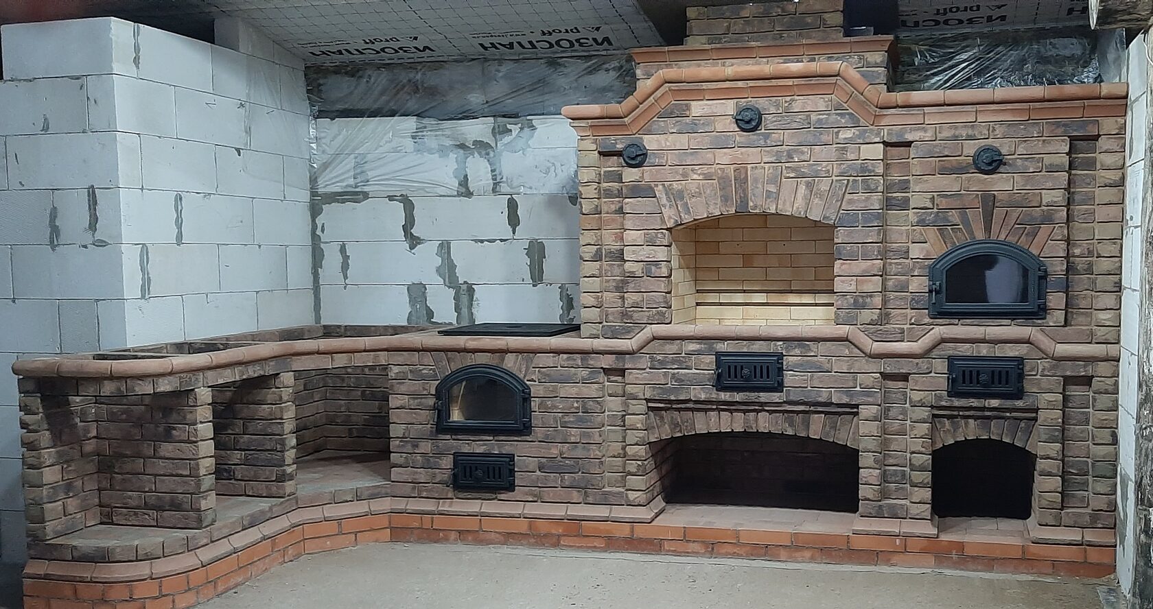 Хотите сбросить вес? Легко. Главная отличительная черта каркасного барбекю — облегчённая конструкция. Металл (внутри которого бальзоватовая вата) обшивается специальным негорючим материалом. Подходит практически любой вид отделки – от штукатурки до клинкерной плитки. Оснастить конструкцию можно казаном, тандыром, мангалом, коптильней, русской мини-печью. Устанавливается такое барбекю на любой вид поверхности. Благодаря технологии вашу каркасную беседку не отличить от кирпичной, в том числе по пожаростойкости. В общем, лёгкость рук и никакого мошенничества!