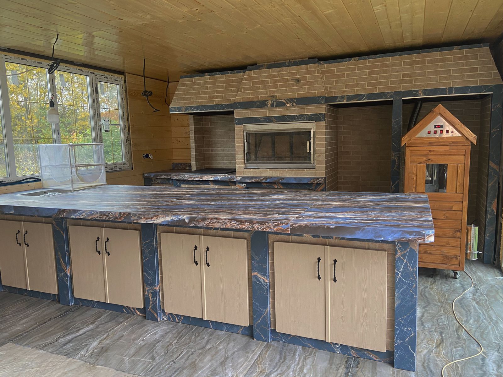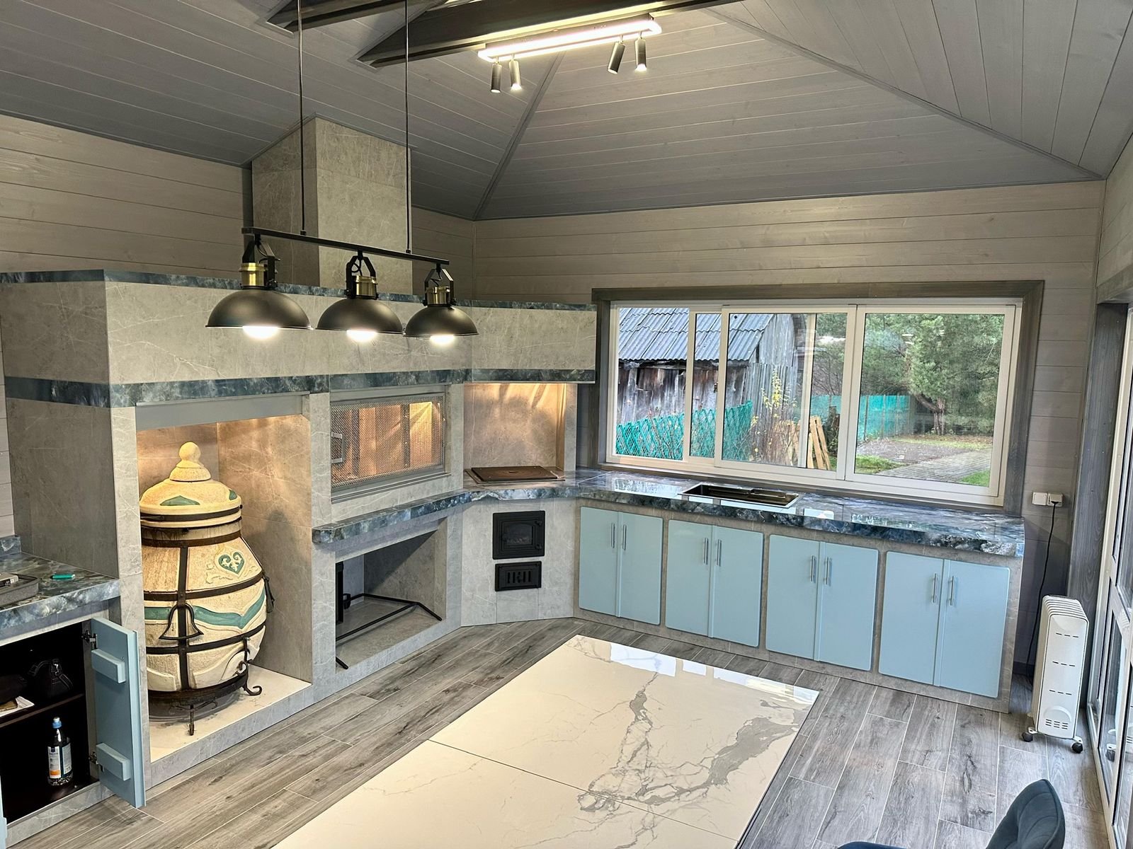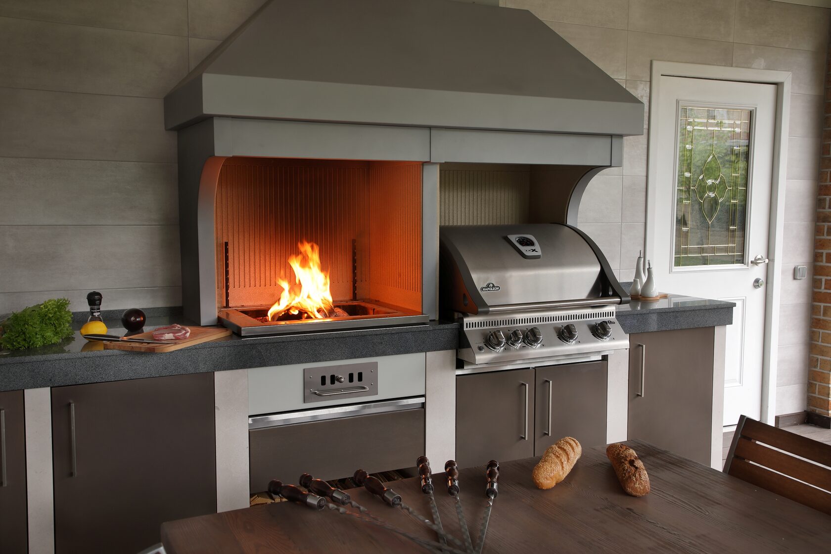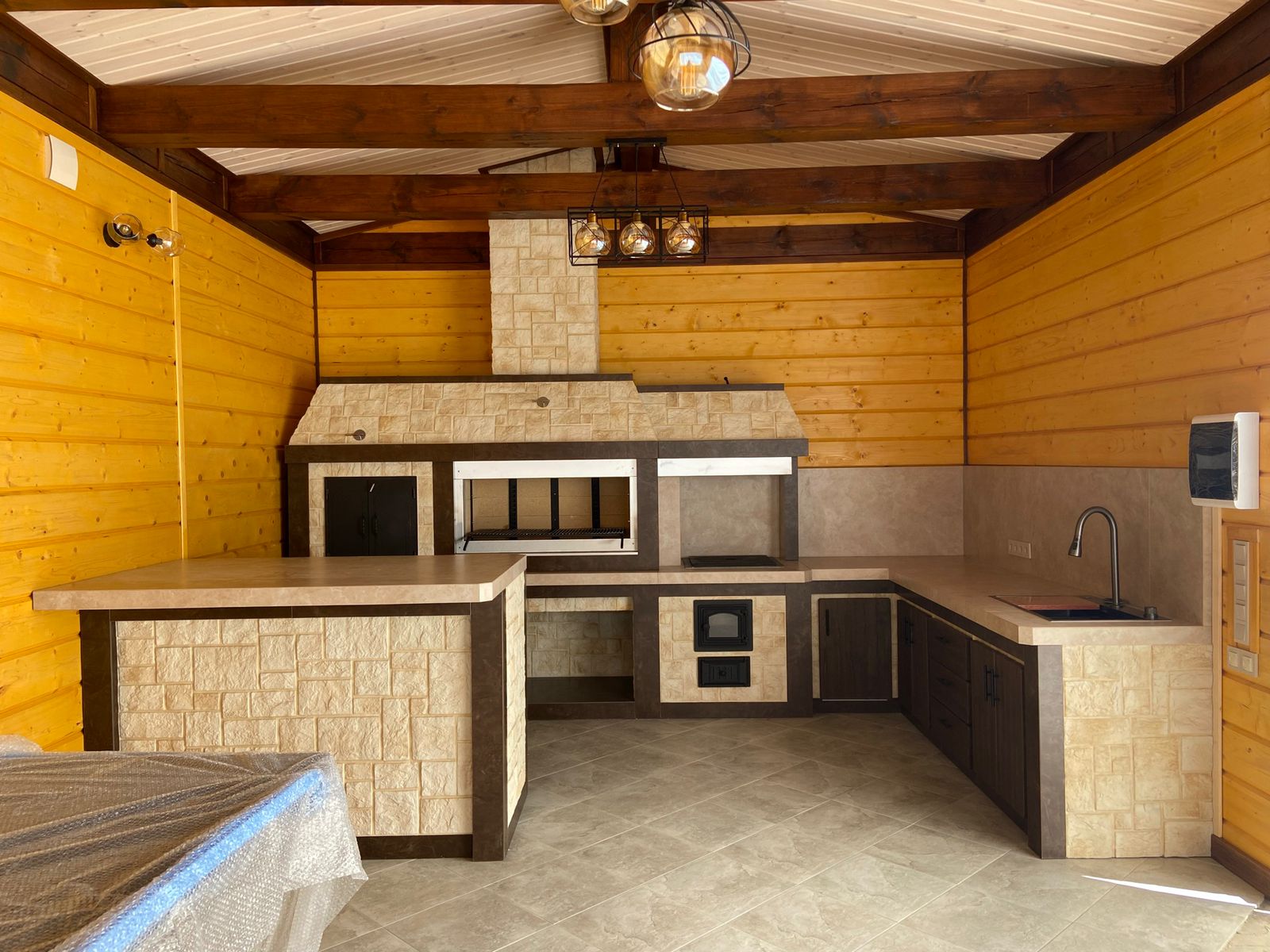 Хотите сбросить вес? Легко. Главная отличительная черта каркасного барбекю — облегчённая конструкция. Металл (внутри которого бальзоватовая вата) обшивается специальным негорючим материалом. Подходит практически любой вид отделки – от штукатурки до клинкерной плитки. Оснастить конструкцию можно казаном, тандыром, мангалом, коптильней, русской мини-печью. Устанавливается такое барбекю на любой вид поверхности. Благодаря технологии вашу каркасную беседку не отличить от кирпичной, в том числе по пожаростойкости. В общем, лёгкость рук и никакого мошенничества!