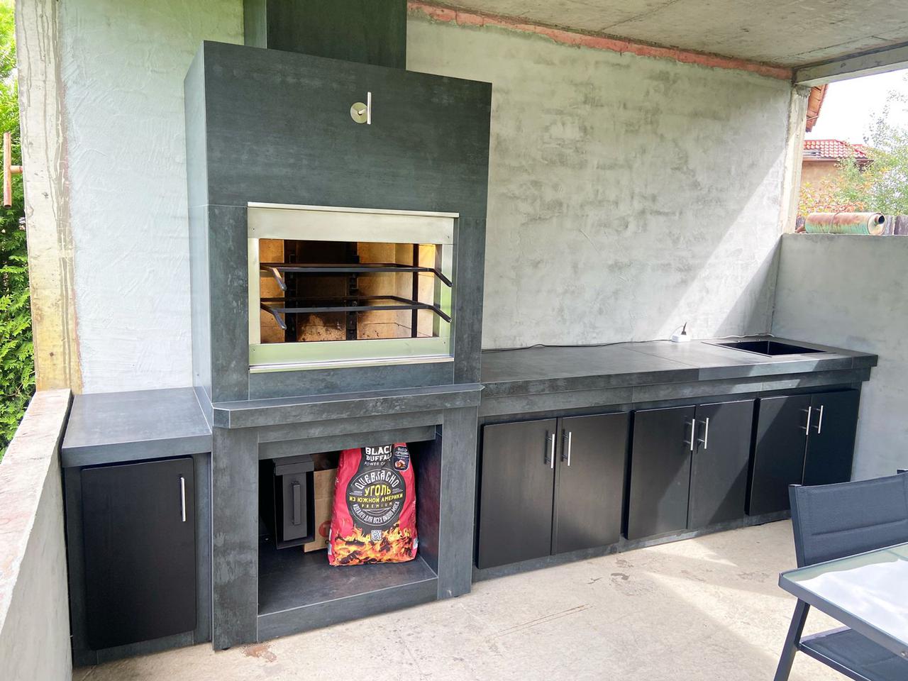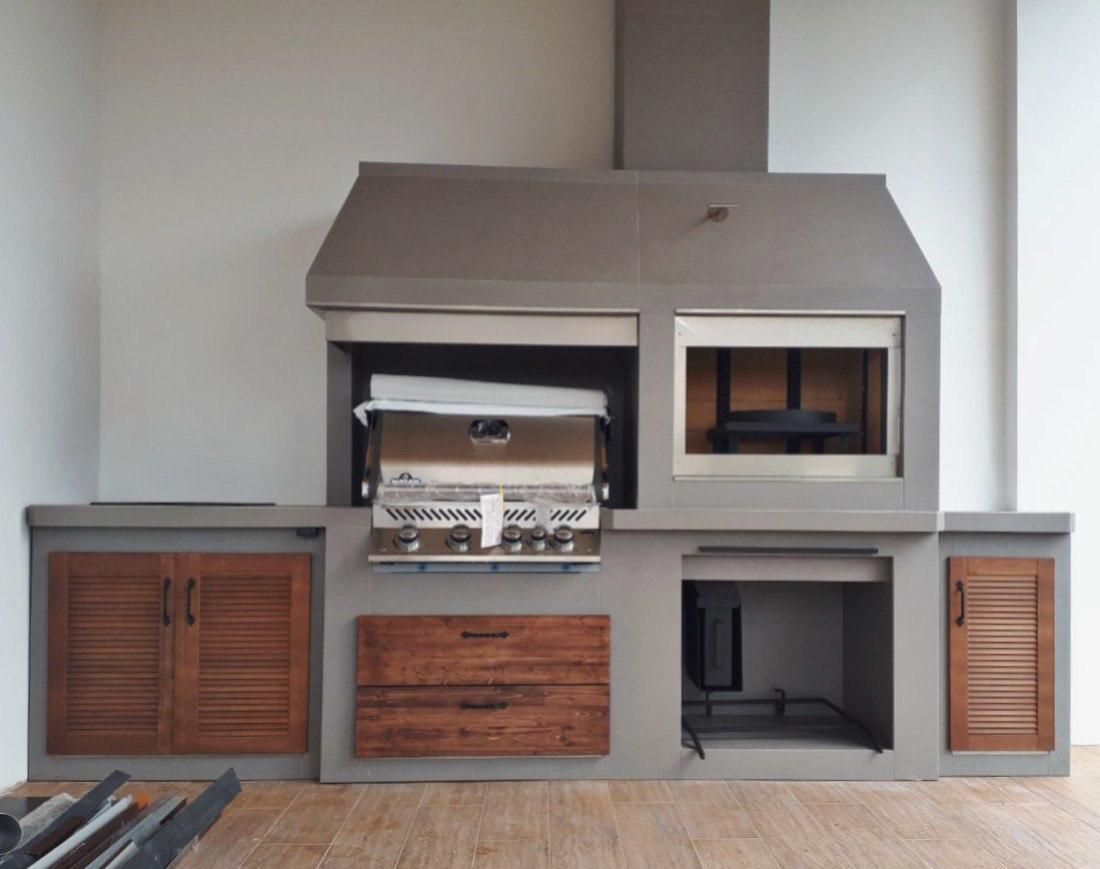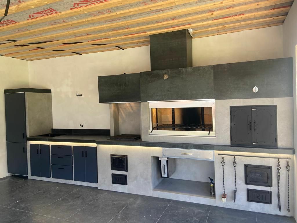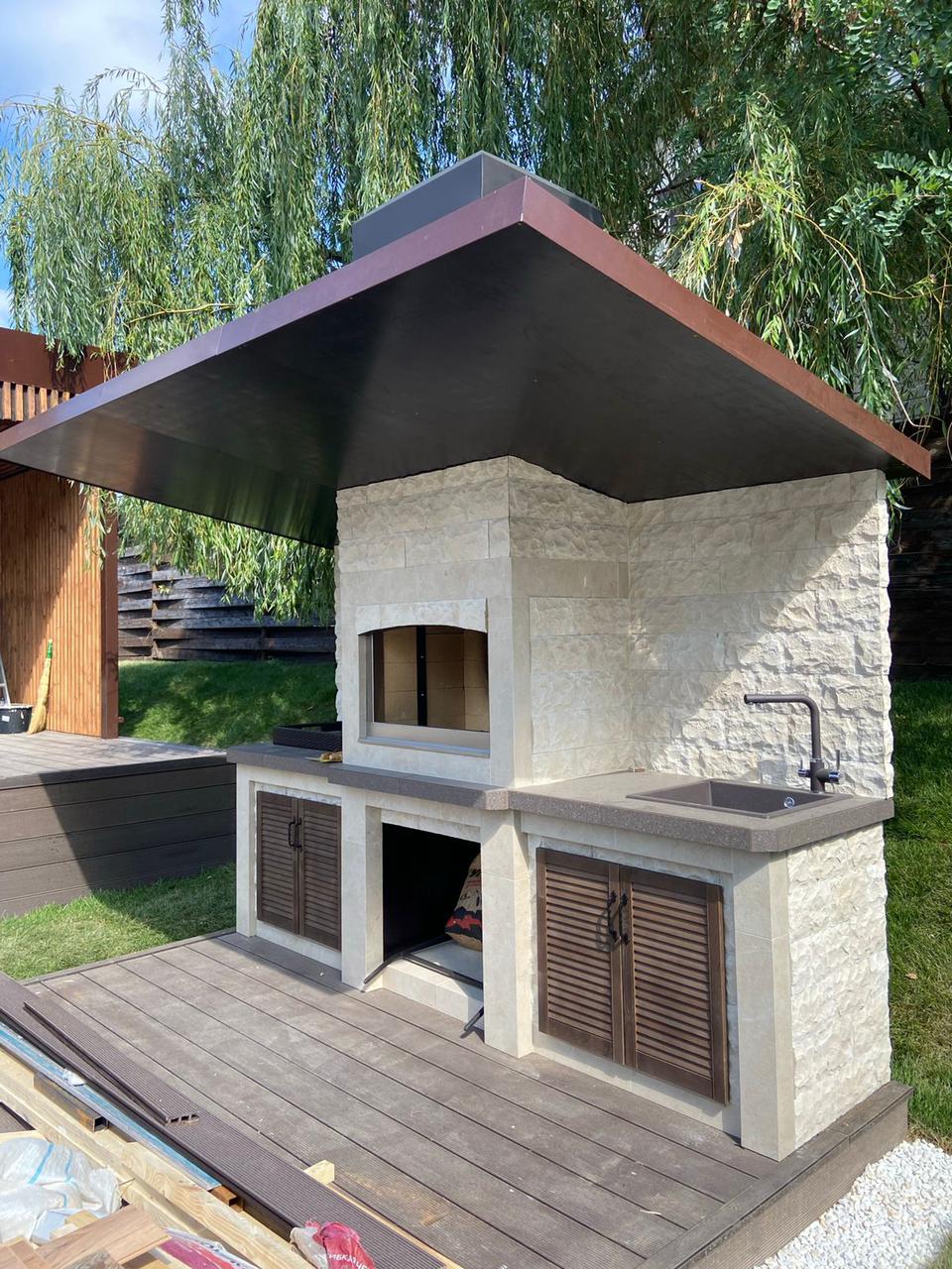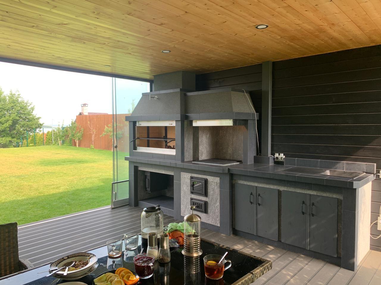Современный барбекю комплекс — это не дань моде. Это выбор людей, которые ценят функциональность и не привыкли отвлекаться по разным мелочам. В основе — литая, не сборная, металлическая конструкция. Для отделки используются материалы тёмных прохладных цветов. Никаких излишеств и декора – строгость и минимализм. Современное барбекю обычно включает в себя газовый гриль. Это экологично. «Кухоная» проектируются под индивидуальный запрос. Лучше всего конструкцию расположить под парящим навесом — это придаст всему участку футуристичность, а вам уверенности в себе. Ведь, выбрав современное барбекю, вы приняли правильное решение!