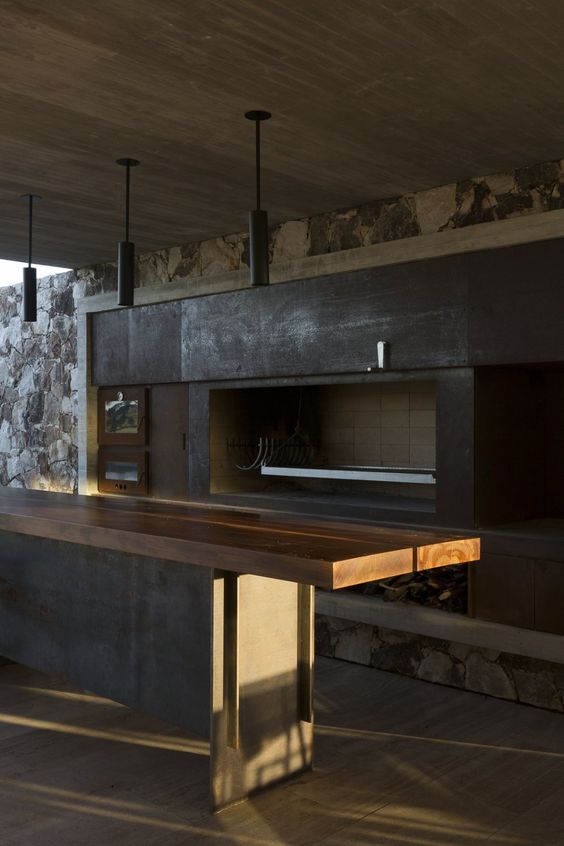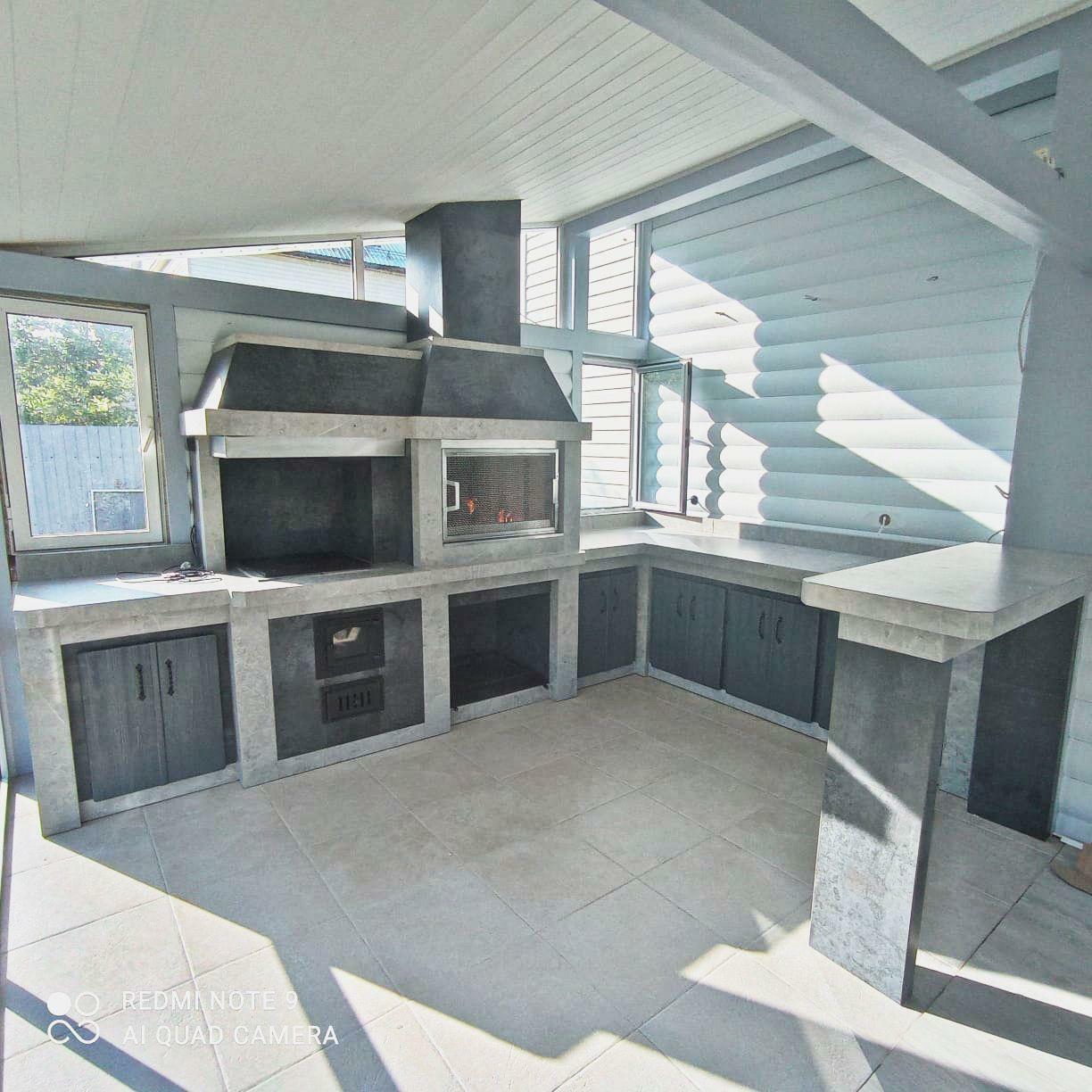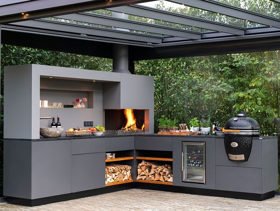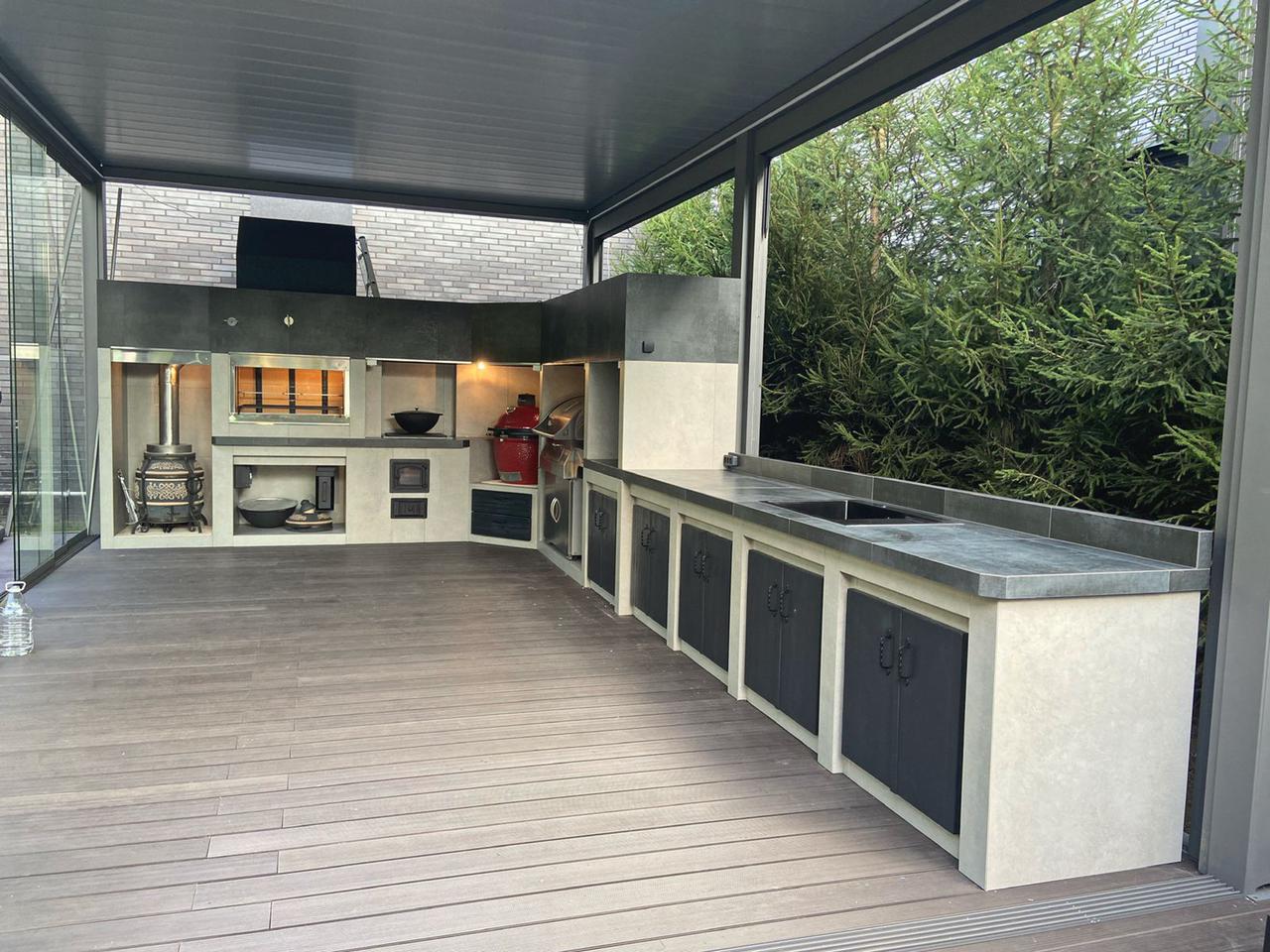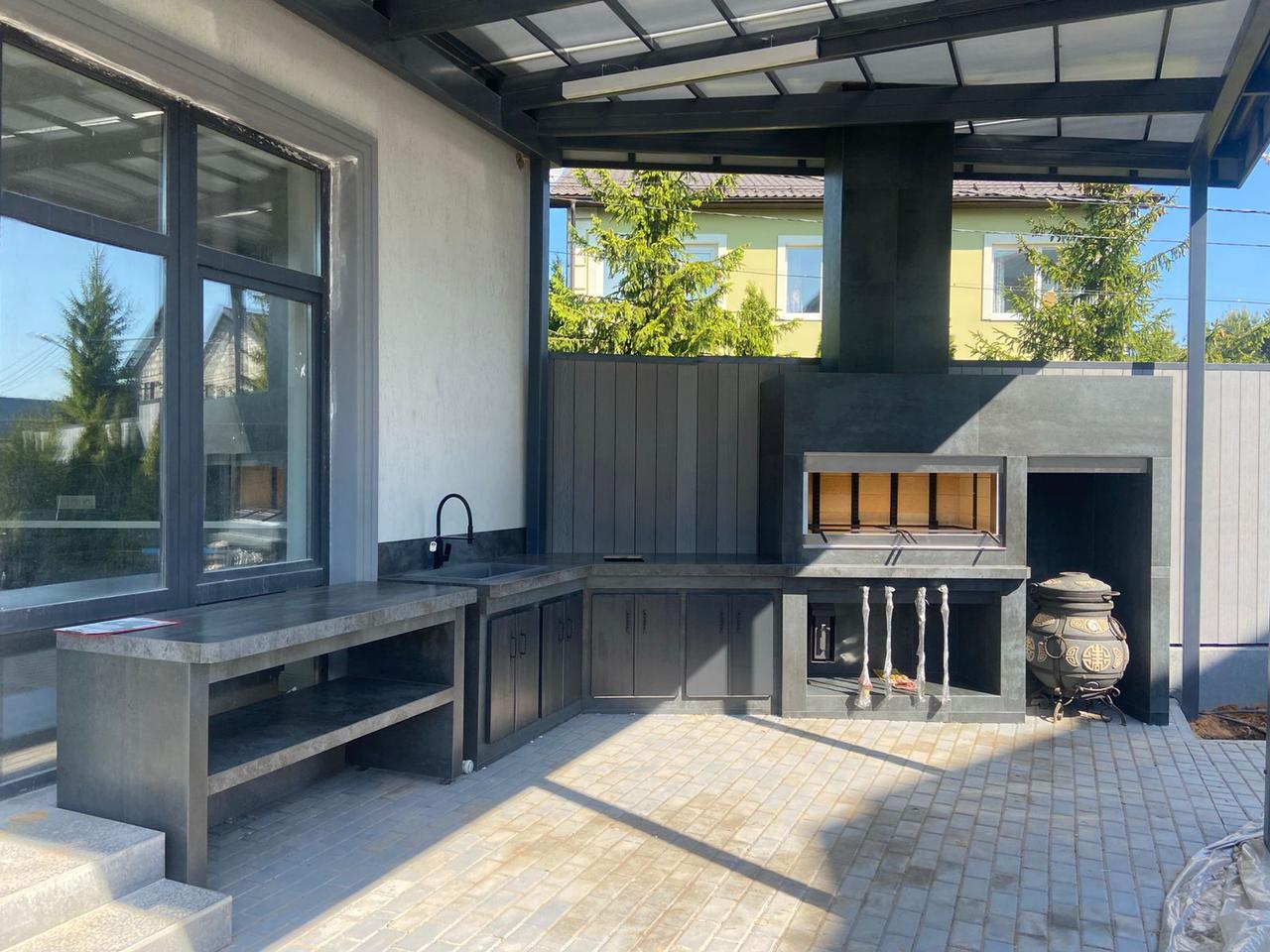 Современный барбекю комплекс — это не дань моде. Это выбор людей, которые ценят функциональность и не привыкли отвлекаться по разным мелочам. В основе — литая, не сборная, металлическая конструкция. Для отделки используются материалы тёмных прохладных цветов. Никаких излишеств и декора – строгость и минимализм. Современное барбекю обычно включает в себя газовый гриль. Это экологично. «Кухоная» проектируются под индивидуальный запрос. Лучше всего конструкцию расположить под парящим навесом — это придаст всему участку футуристичность, а вам уверенности в себе. Ведь, выбрав современное барбекю, вы приняли правильное решение!